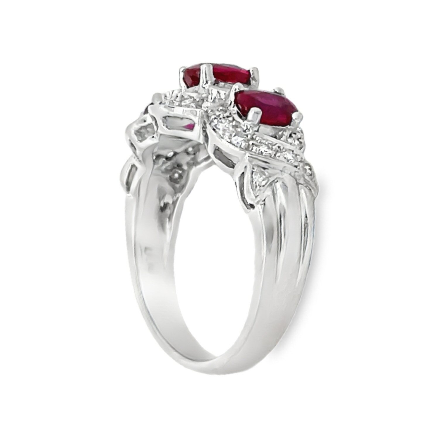Gorgeous platinum ruby and diamond ring. There are 3 oval rubies of bright red, clear quality surrounded by 0.68cttw diamonds. The center stone is a .83carat oval ruby, with a .46 carat oval ruby on either side of the center stone. There is a bezel set marquise cut diamond between the rubies and round brilliant cut diamonds prong set in the remaining space around the rubies, totaling .68cttw diamonds.