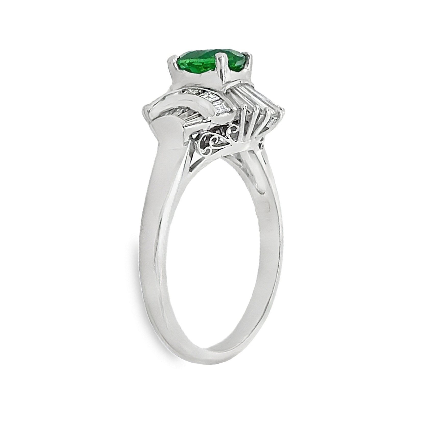 Platinum vintage diamond ring with a 1.35carat oval Tsavorite garnet in the center. The natural garnet is a bright, clear lively green. It is accented with .80cttw diamonds, most of which are baguette cut.