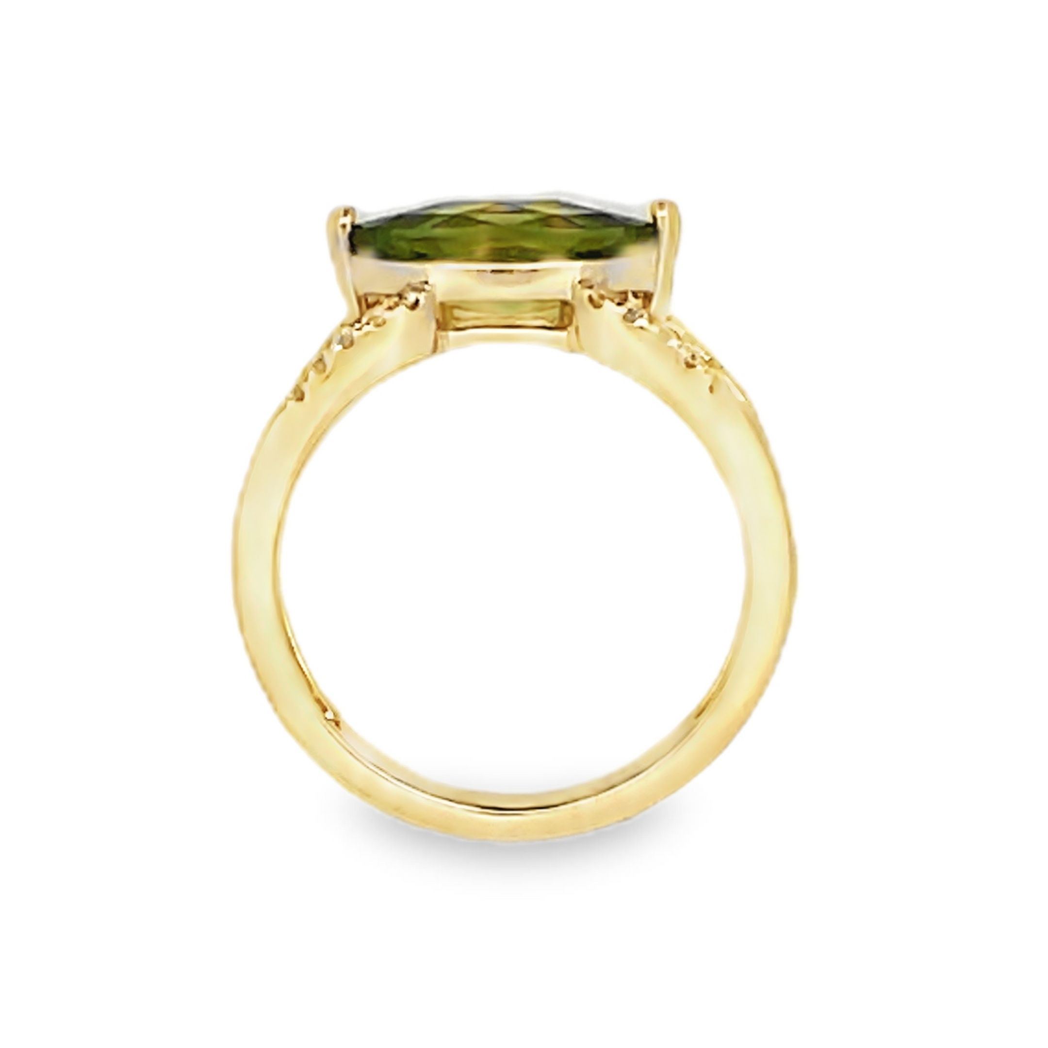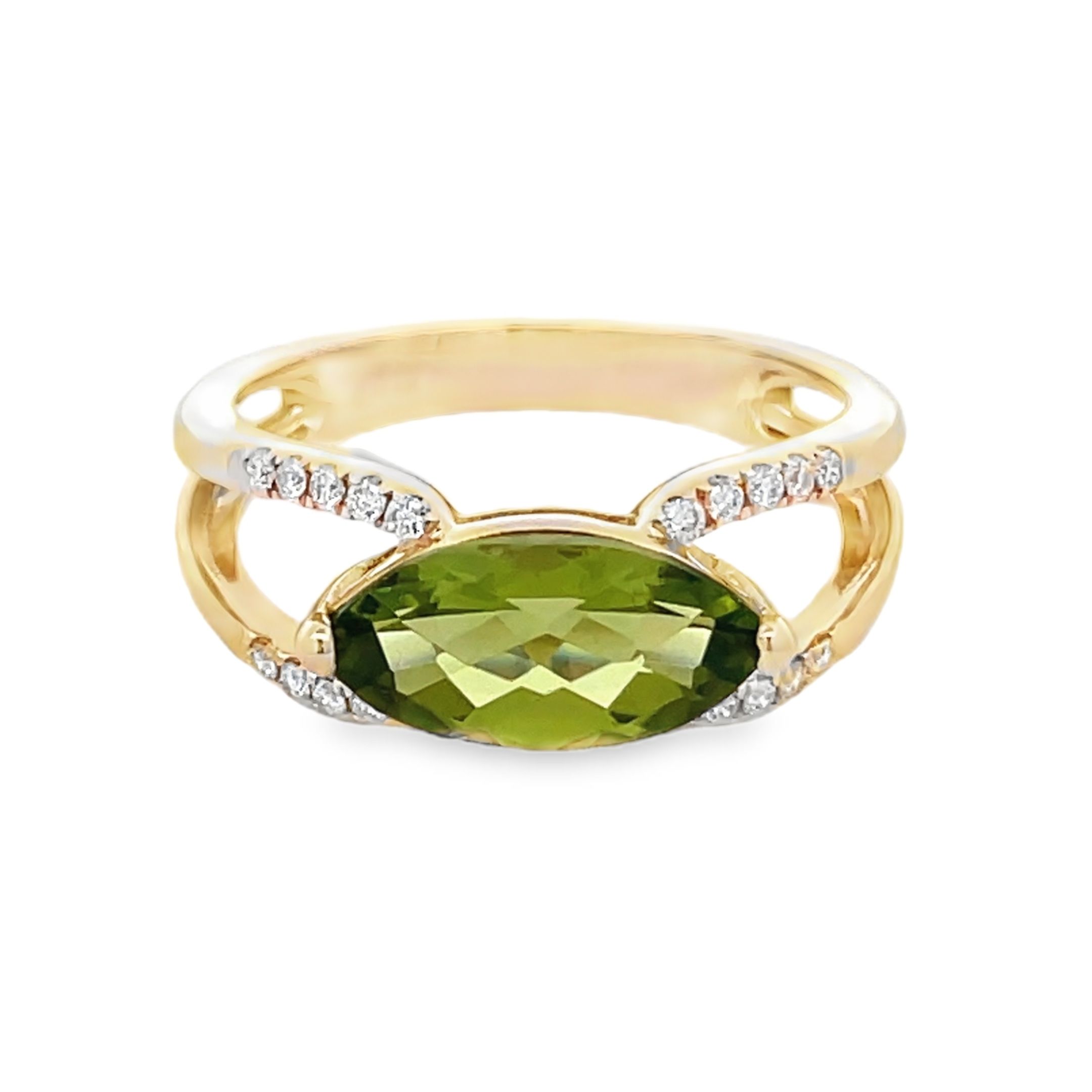 Unique and gorgeous 14 karat yellow gold peridot and diamond ring. The centerpiece of this ring is a 2.25 carat marquise cut peridot, accented by .16cttw round brilliant cut diamonds.