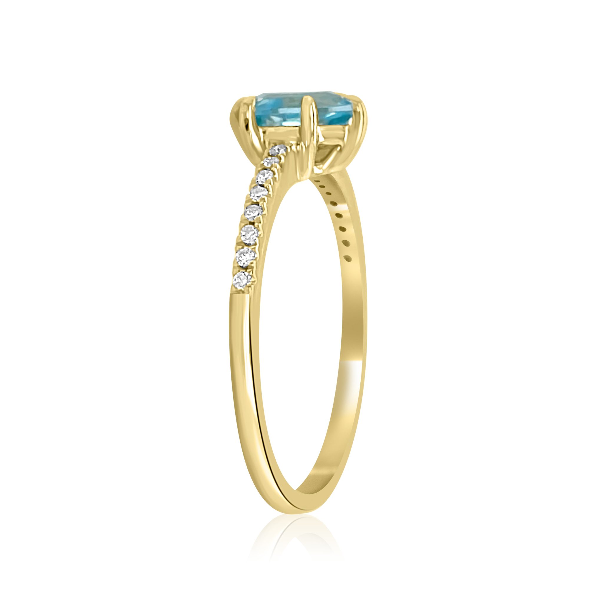Elevate your style with this stunning geometric 14 karat yellow gold blue topaz and diamond ring. The 1.23 carat hexagon cut blue topaz is prong set and rests on a band with 0.10cttw prong set round brilliant cut diamonds.