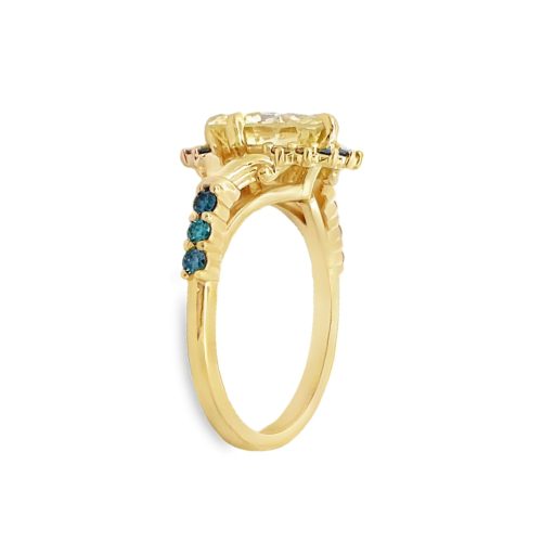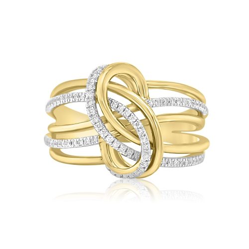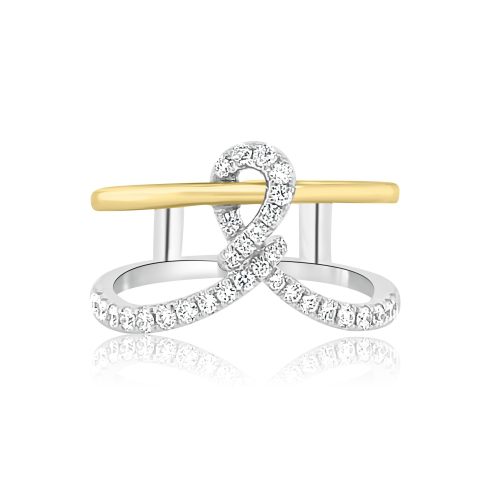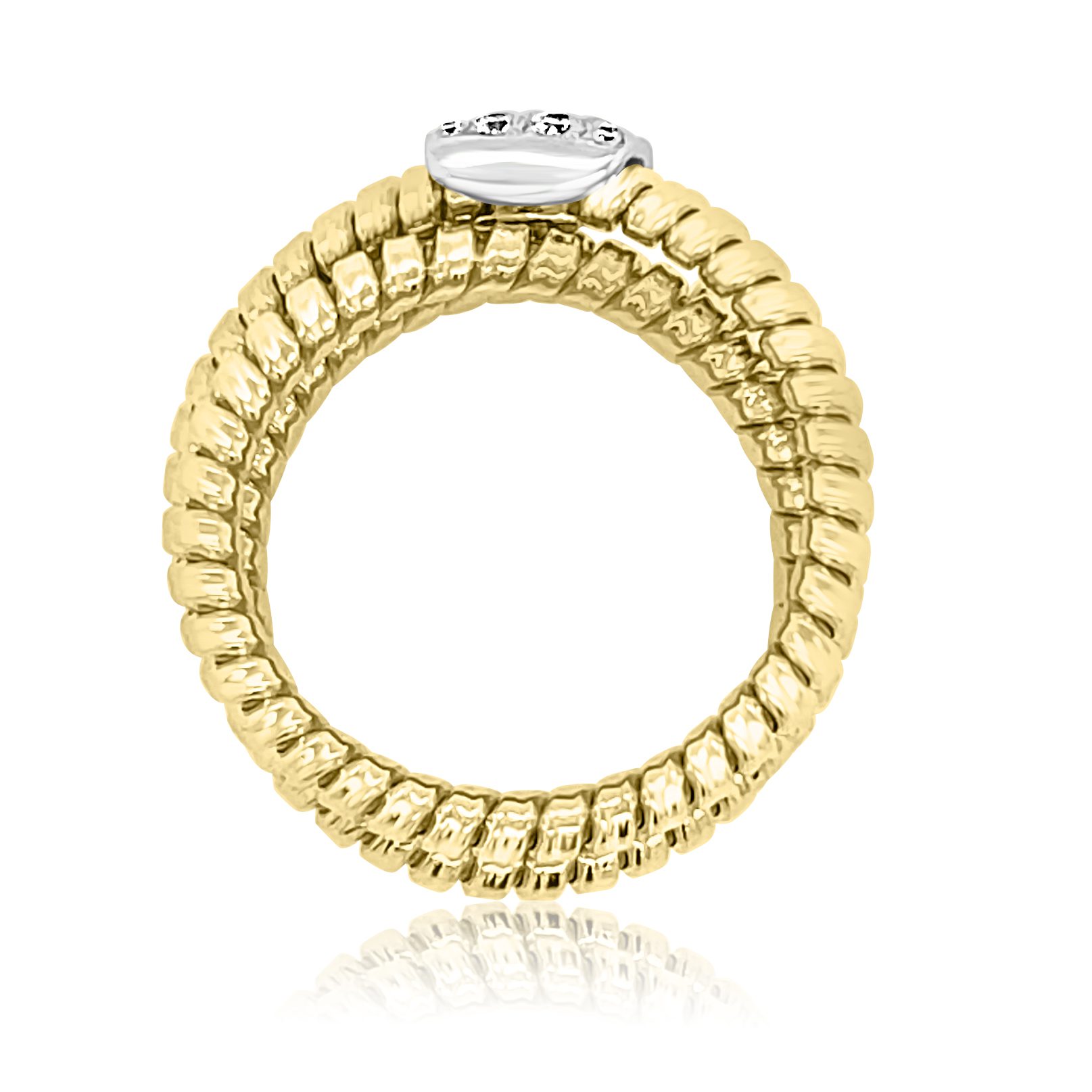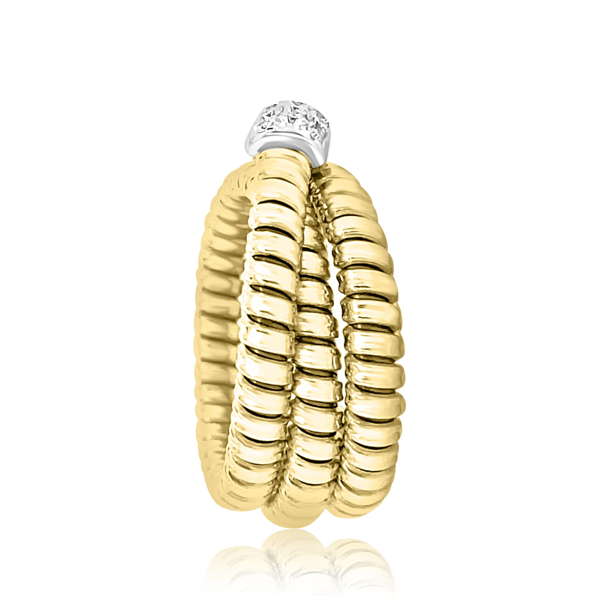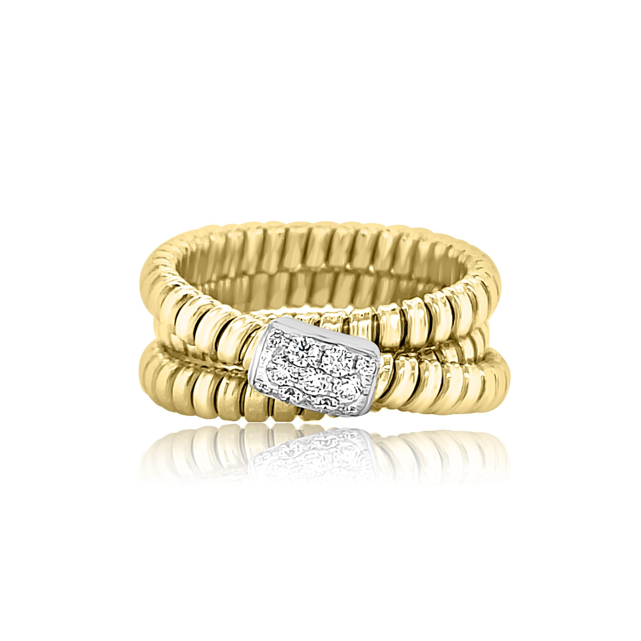 18 karat yellow and white gold flexible, triple coil ring with 0.19 cttw round brilliant cut diamonds. All of the diamonds are VS clarity. G color, and pave set in white gold.