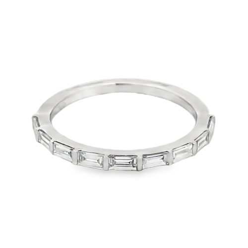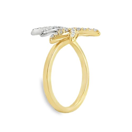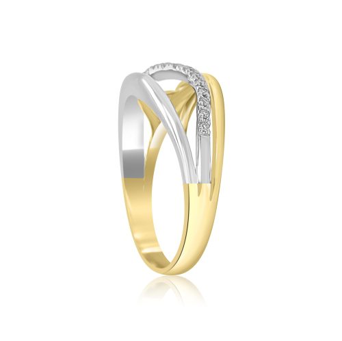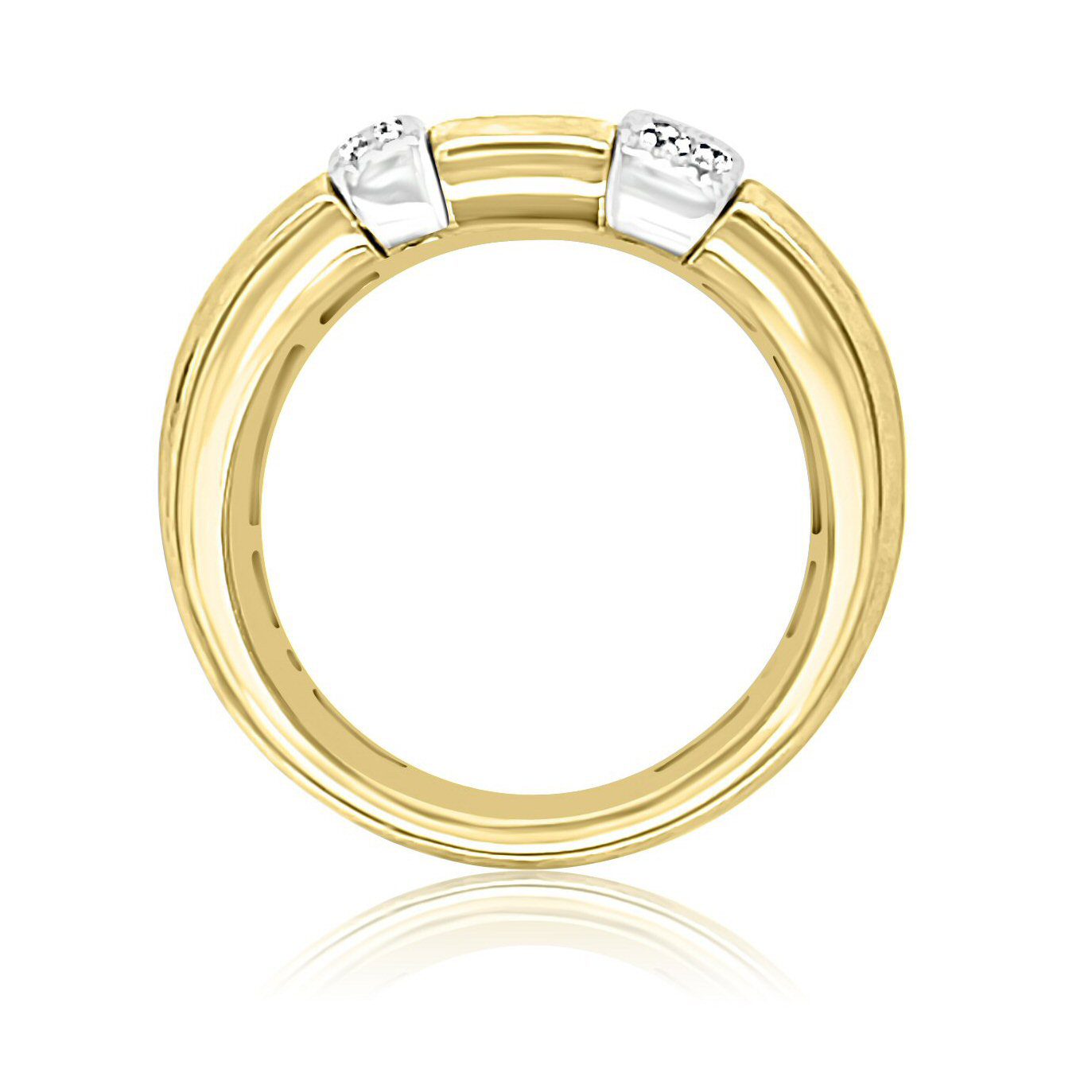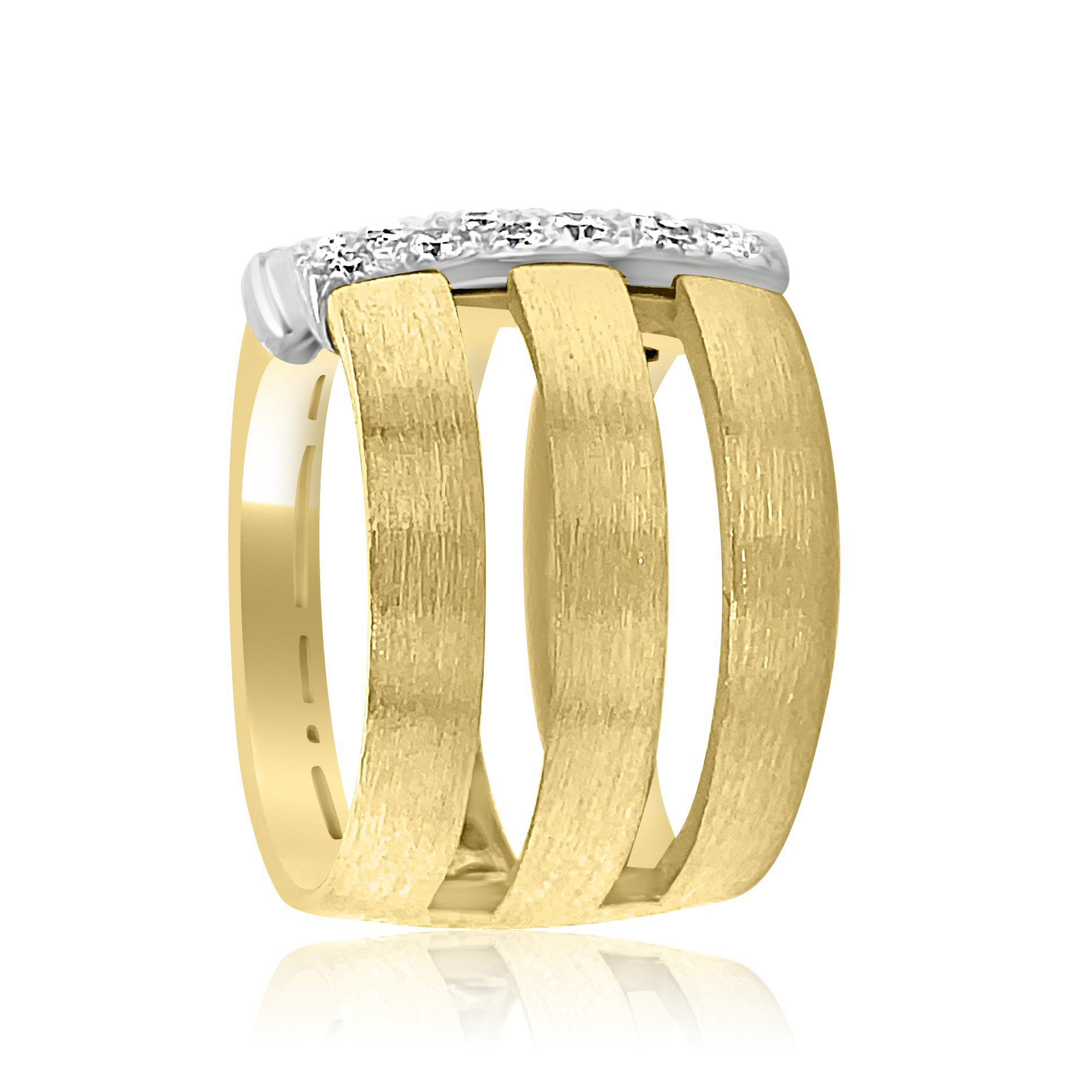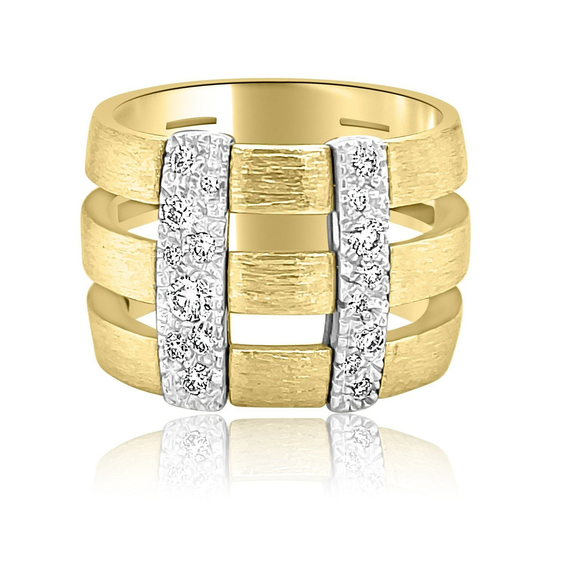 Gorgeous 18 karat yellow and white gold 14.4mm wide band. The ring consists of three, 3mm wide rows with 2mm of space between each row. There are 0.36cttw round brilliant cut diamonds pave set in 2 vertical rows at the top of the ring. It has a diamond wheel finish and all of the diamonds are VS clarity, G color.