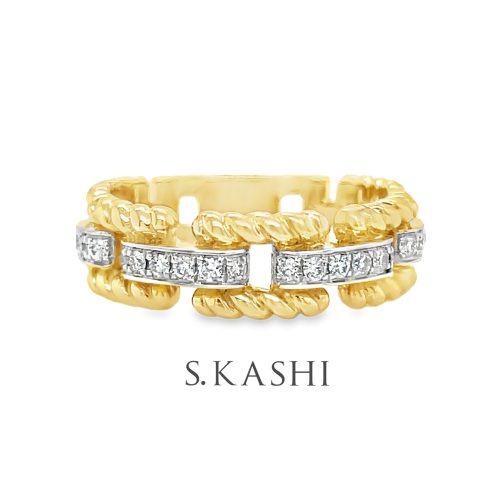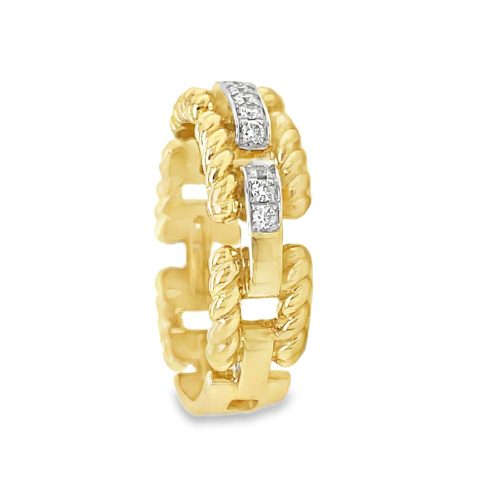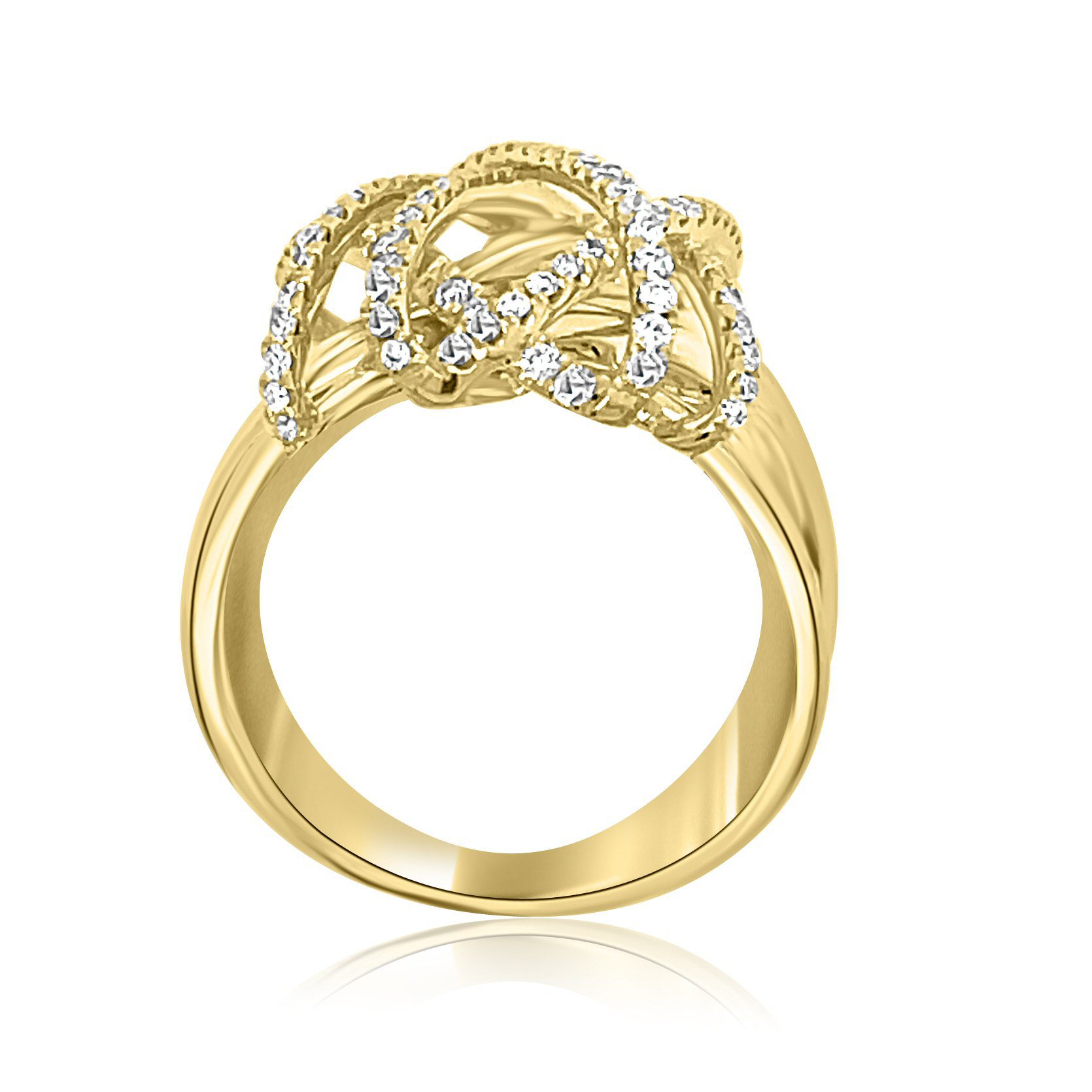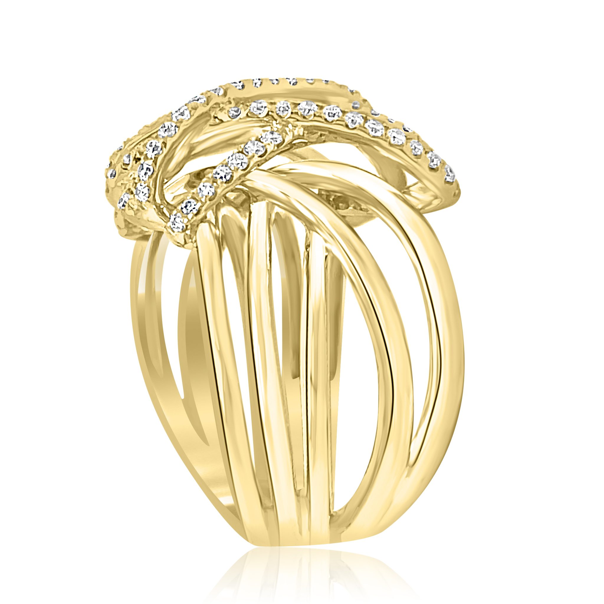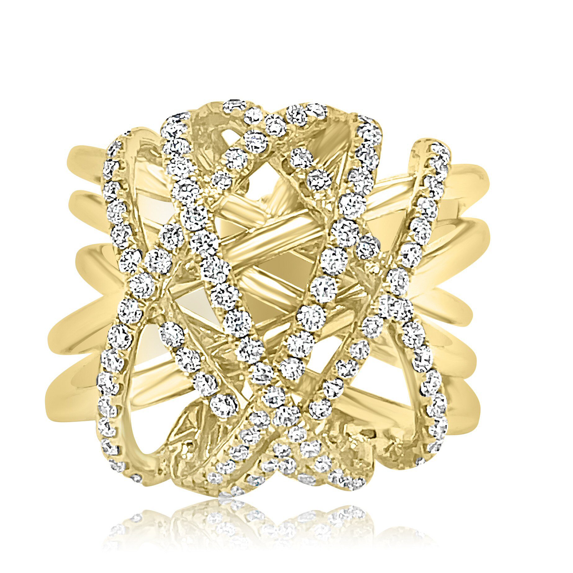 Super cool 18 karat yellow gold ring with 0.68cttw round brilliant cut diamonds. The band consists of 5 bands intertwining each other. The diamonds are prong set in 6 strips intertwining with each other on top of the ring. All of the diamonds are VS clarity and G color.
