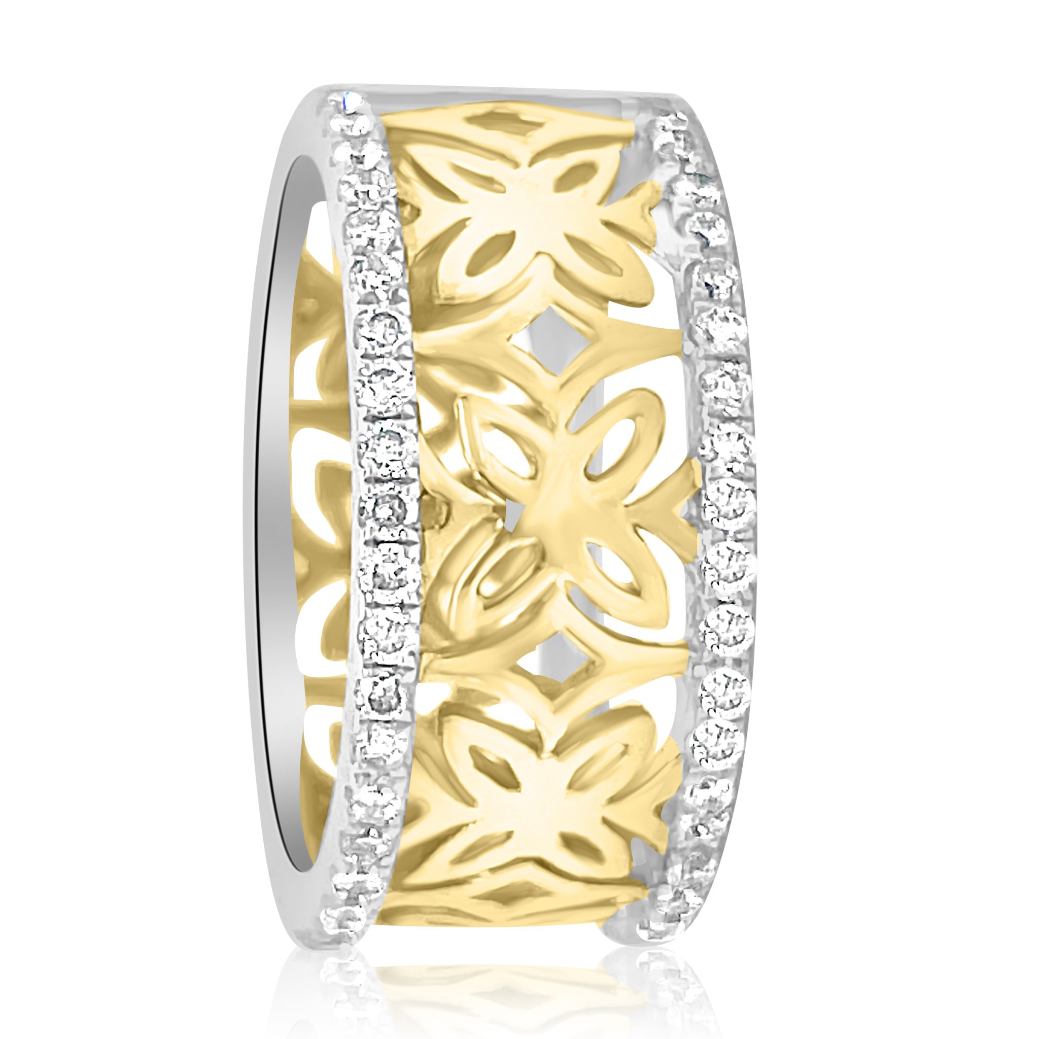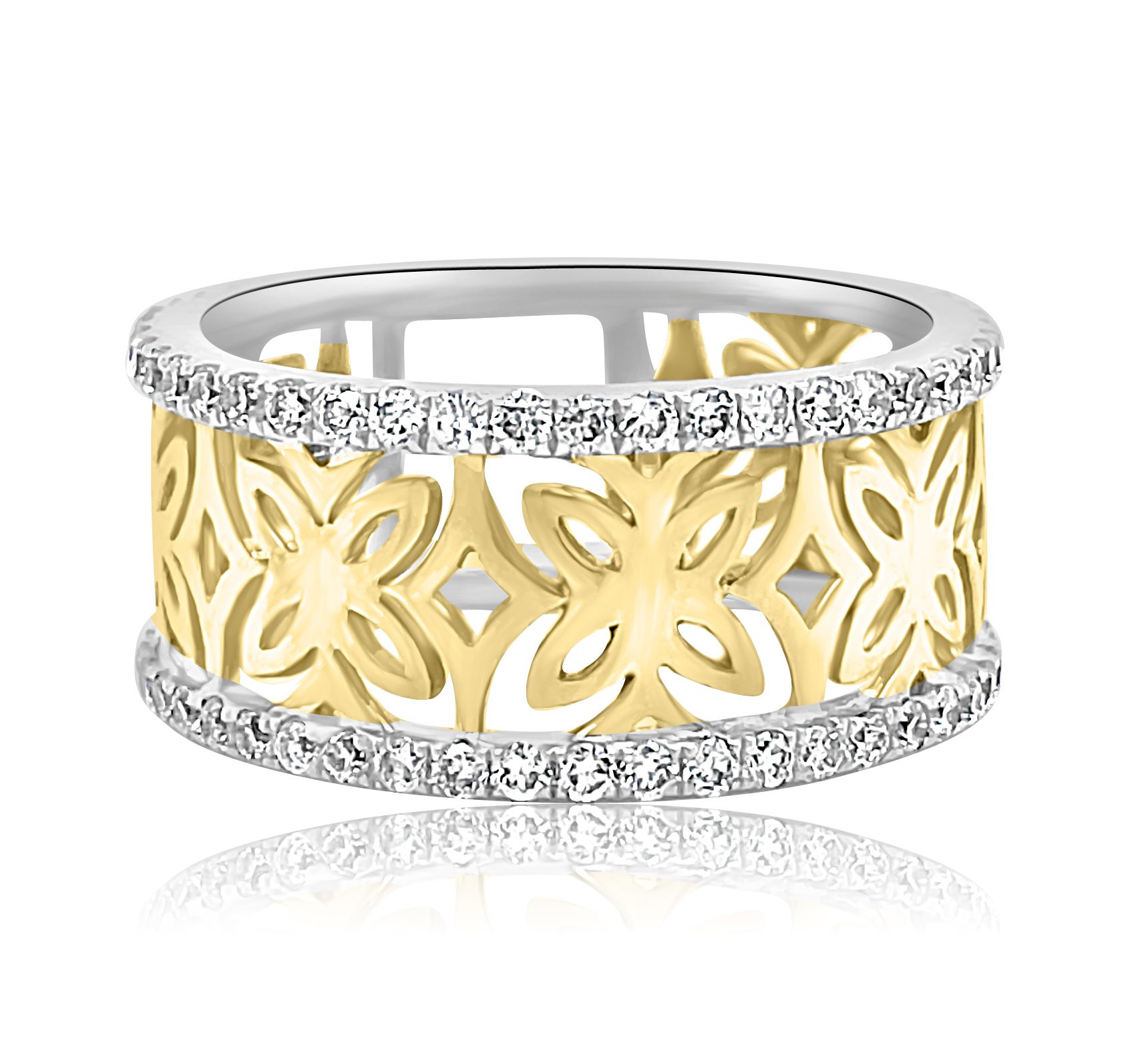 14 karat yellow and white gold 9mm wide band with 0.85cttw round brilliant cut diamonds. The center of the band is butterfly like cut outs of yellow gold. They are accented on each side with prong set round brilliant cut diamonds.