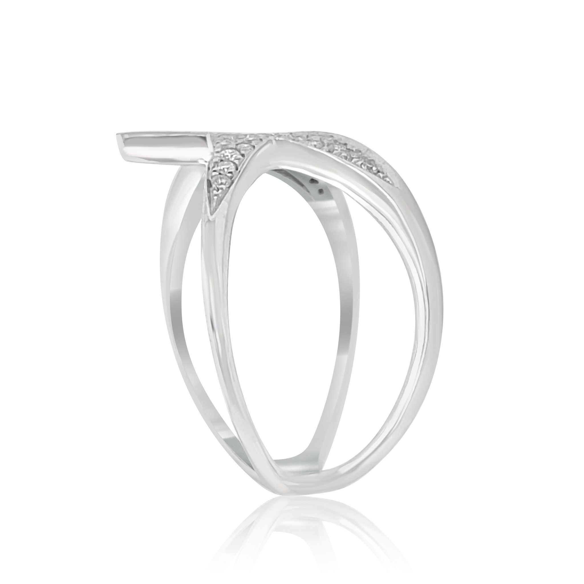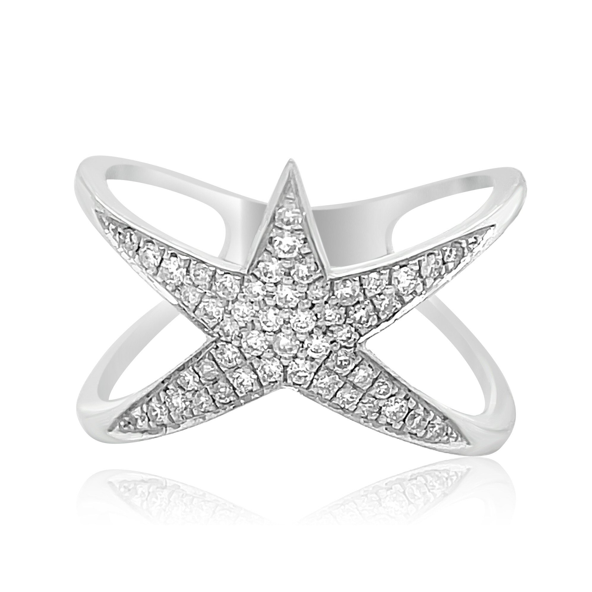 18 karat white gold wide and elongated “star” ring with 0.32cttw bead set round brilliant cut diamonds.