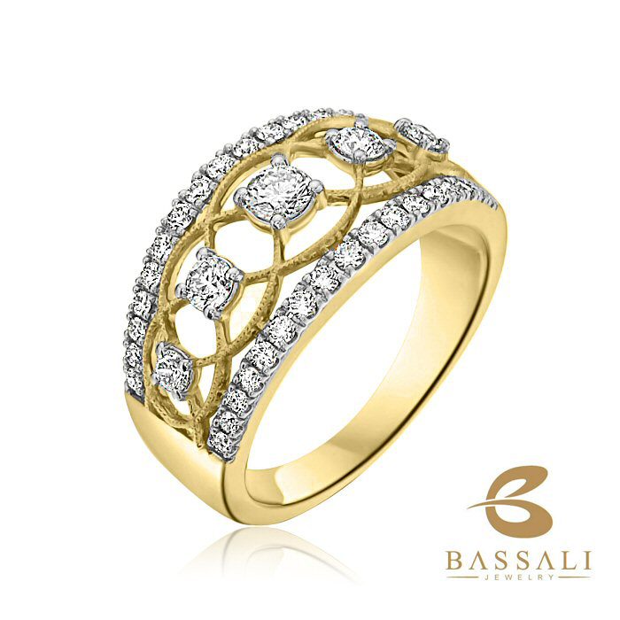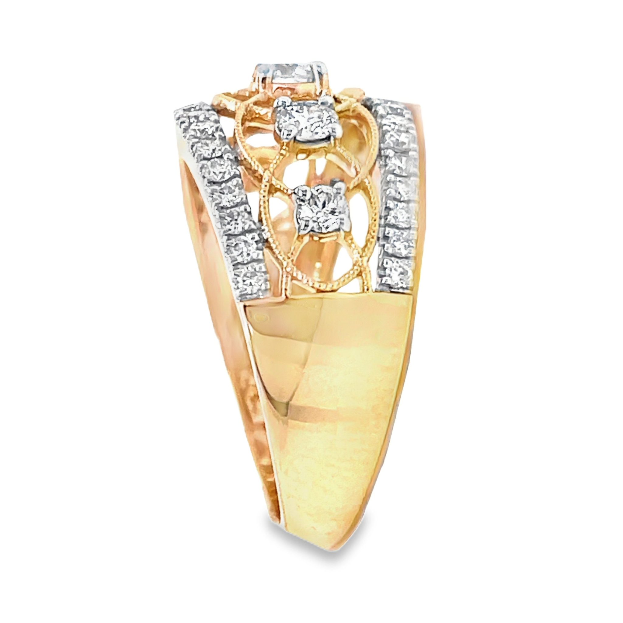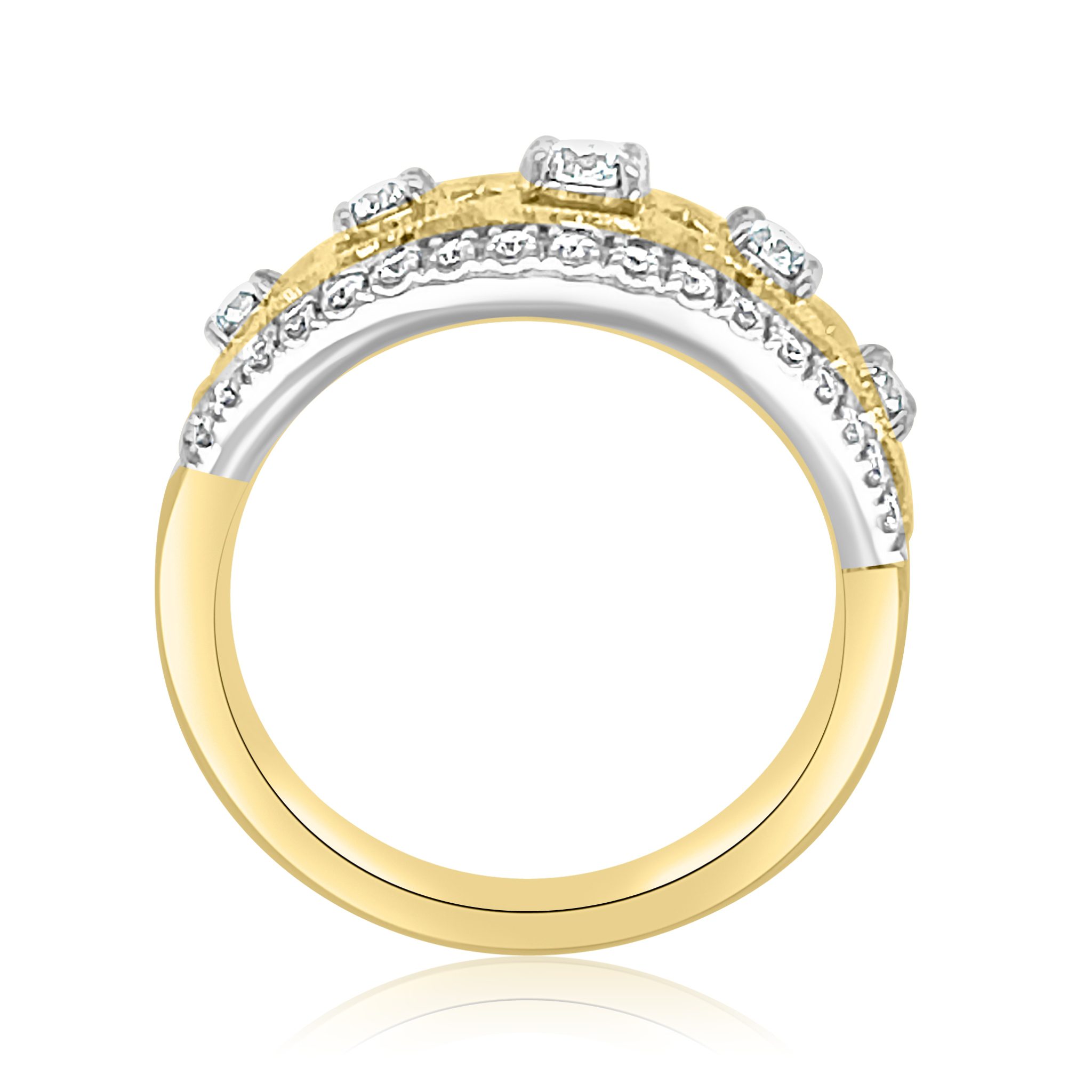 14 karat yellow gold 0.75 cttw wide diamond ring. There are 5 round brilliant cut diamonds, prong set in a center row separated with ribbony milgrain edges. The remaining diamonds are prong set in a row on either side of the center row.