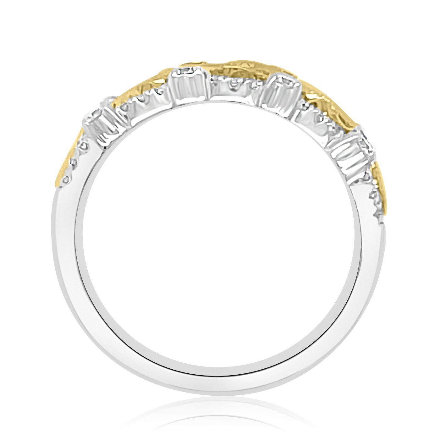 14 karat yellow and white gold 0.75 cttw diamond ring. There is a center row of 5 round brilliant cut diamonds which are prong set inside a yellow gold ribbon with milgrain edges. The remainder of the ring is white gold and on either side of the center row, there is a row of prong set diamonds. These are smaller diamonds, alternating with larger diamonds for a completely unique look.