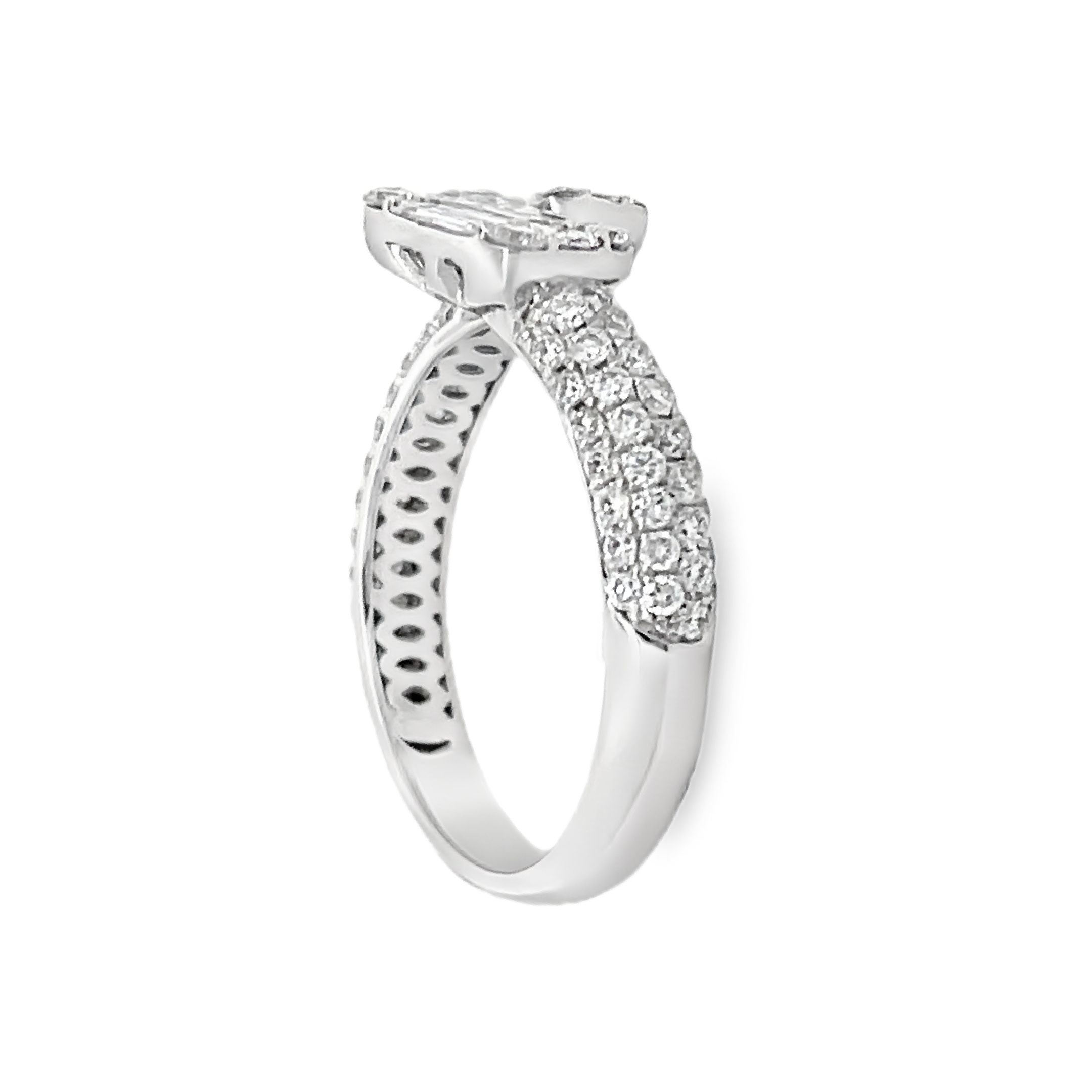 18 karat white gold bypass style ring wtih a 1.11cttw baguette and round brilliant cut diamonds.