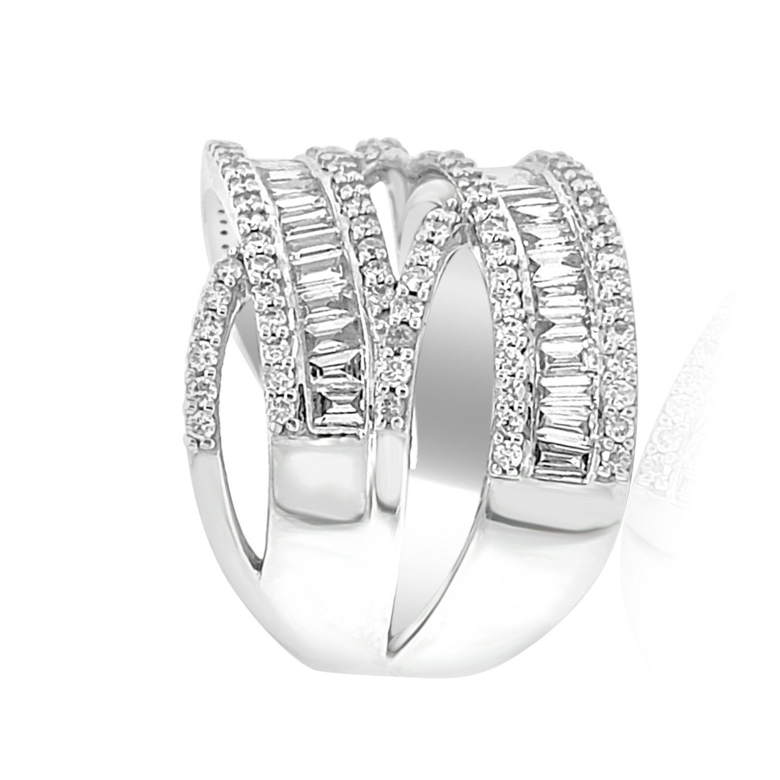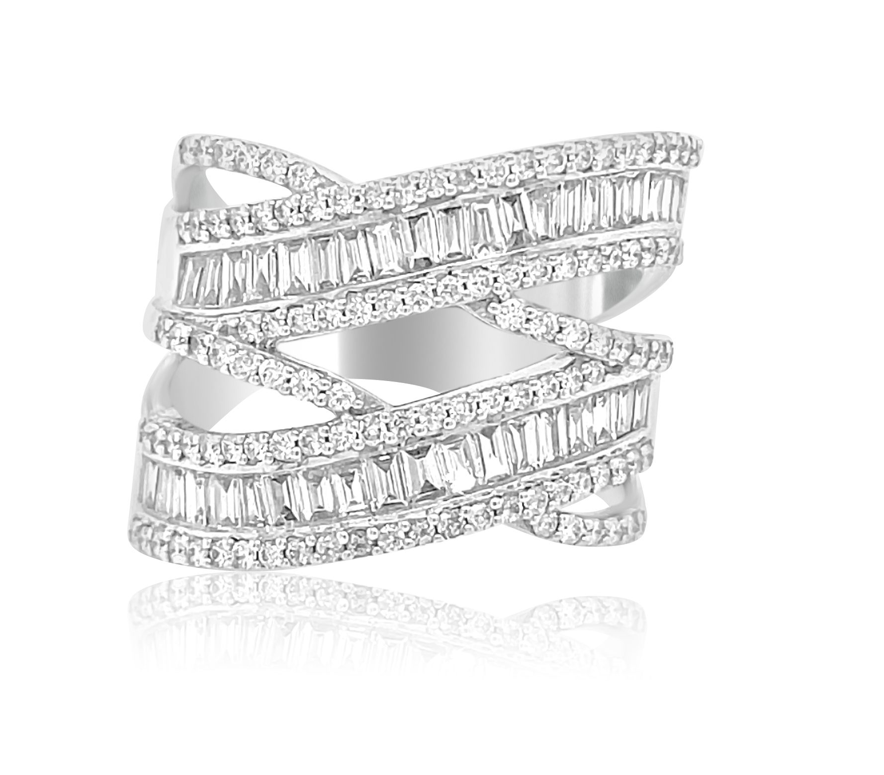 Amazing and unique 14 karat white gold 1.38cttw diamond ring! There are 2 rows of channel set baguette cut diamonds, diagonally crossing over 2 thin rows of prong set round brilliant cut diamonds. Double X marks the spot!
