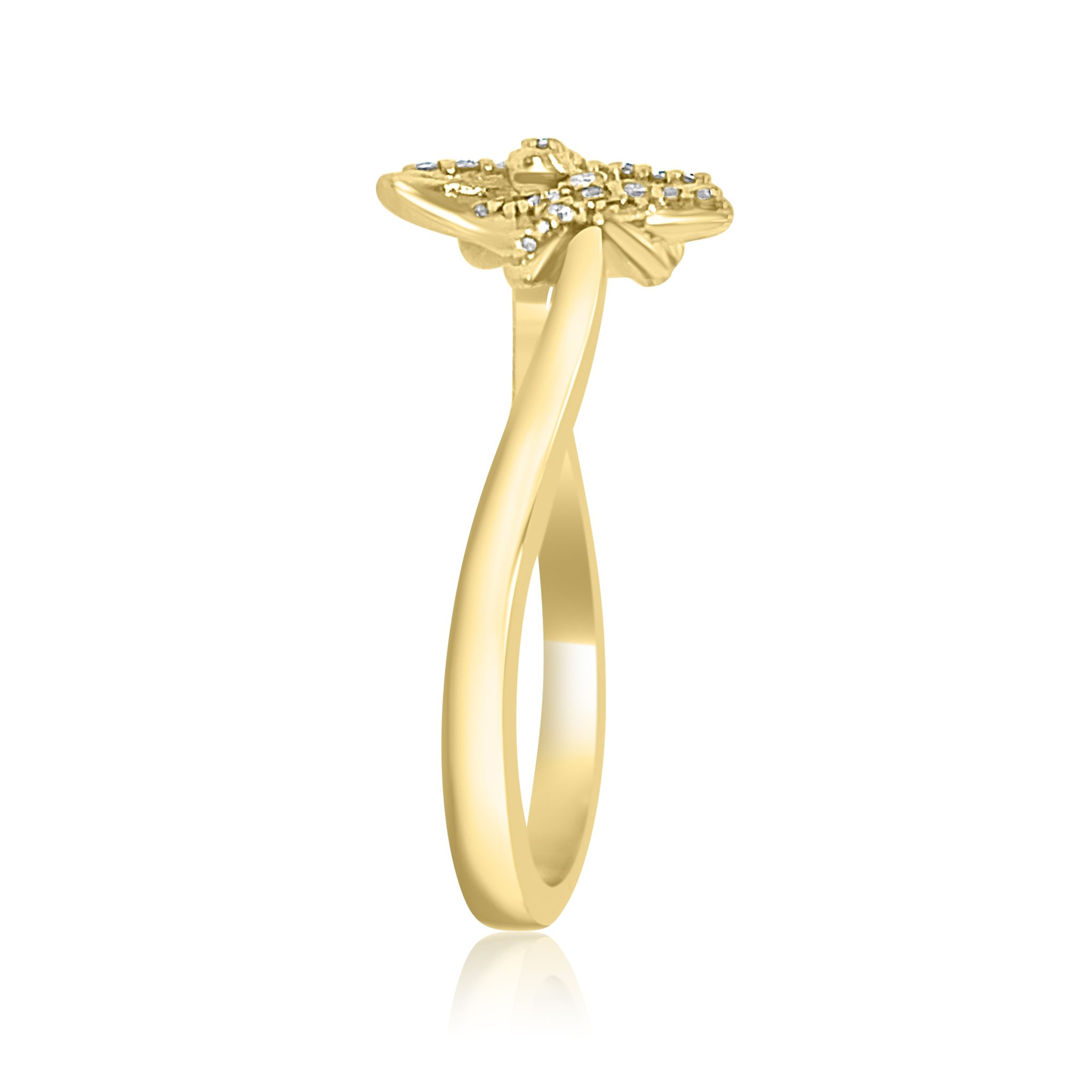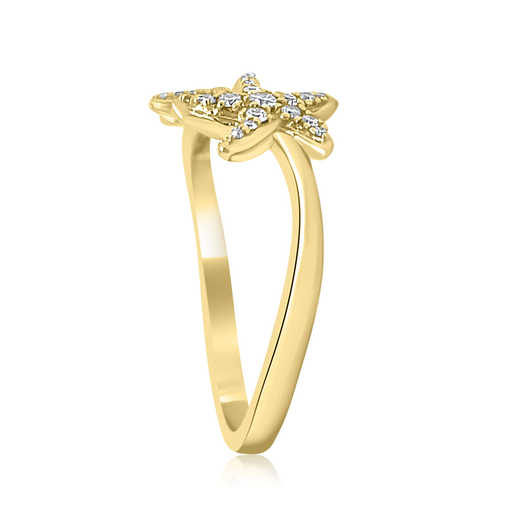 Lovely 14 karat yellow gold diamond starfish ring. The .15 carat round brilliant cut diamonds are prong set into two double starfish.