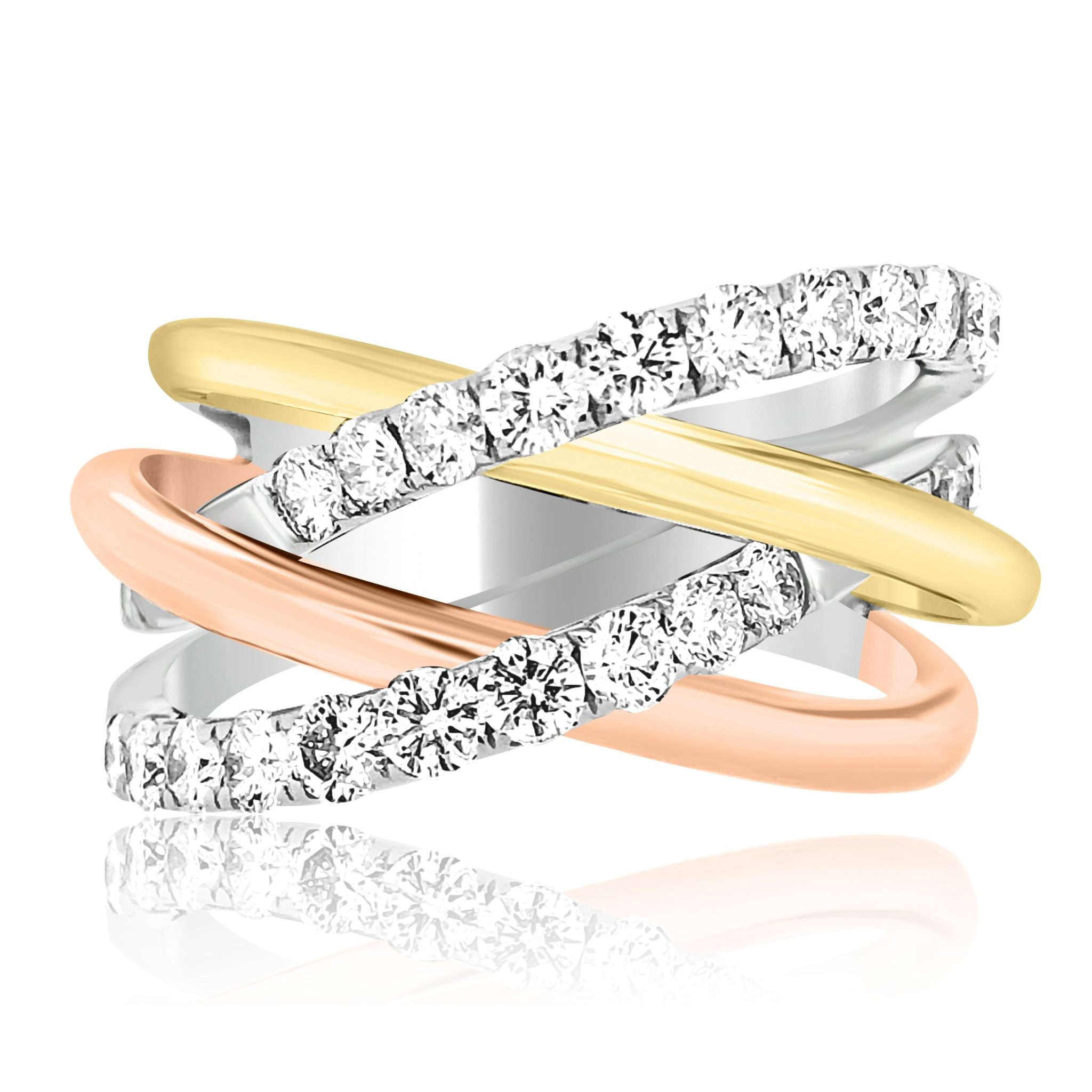 14 karat white, rose and yellow gold diamond ring. This gorgeous crisscross ring consists of one rose gold band and 1 yellow gold band, both high polished. Criss-crossing between those 2 bands are 2 white gold bands, full with 1.26cttw round brilliant cut diamonds. A big, beautiful statement piece at an affordable price.