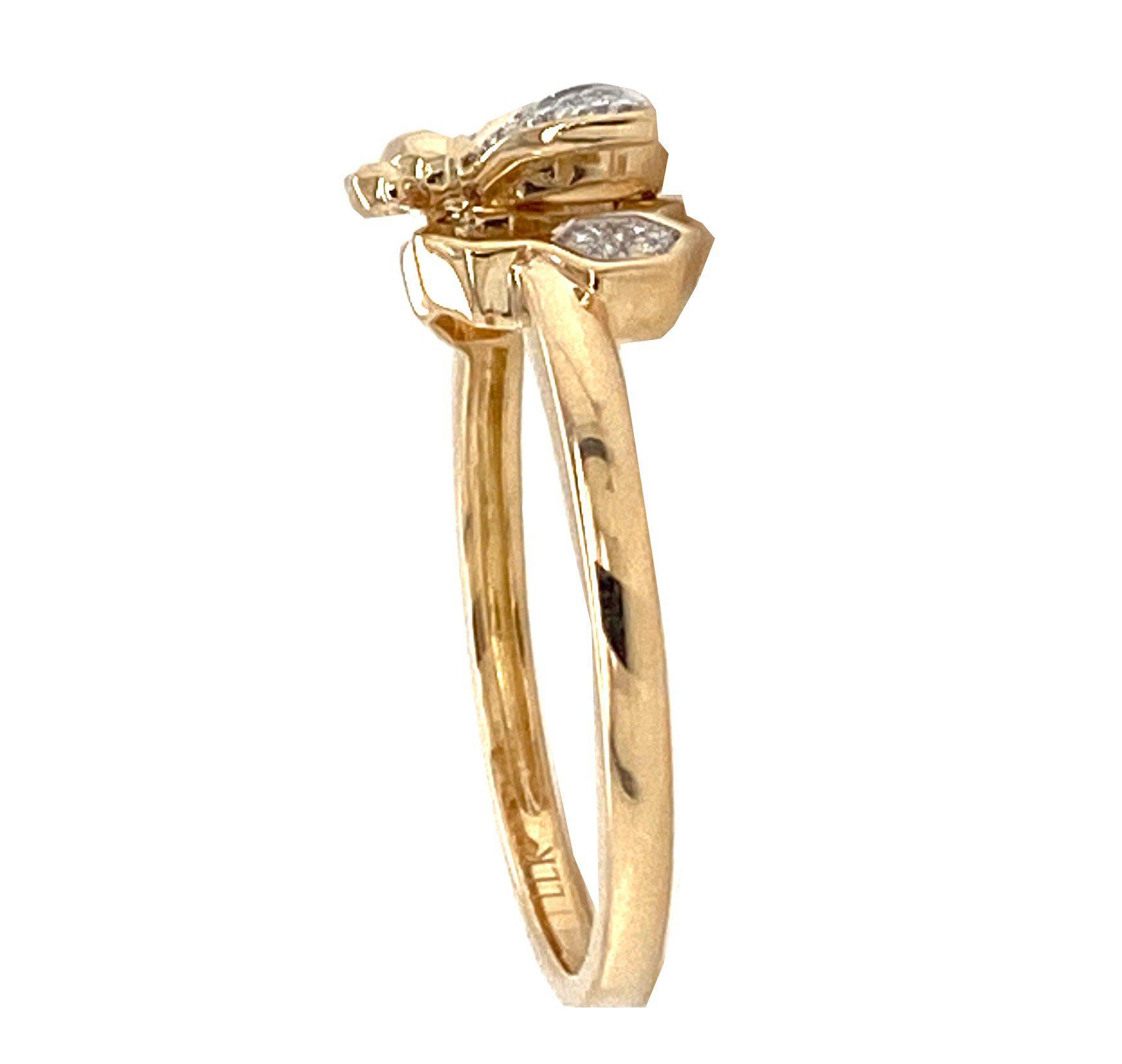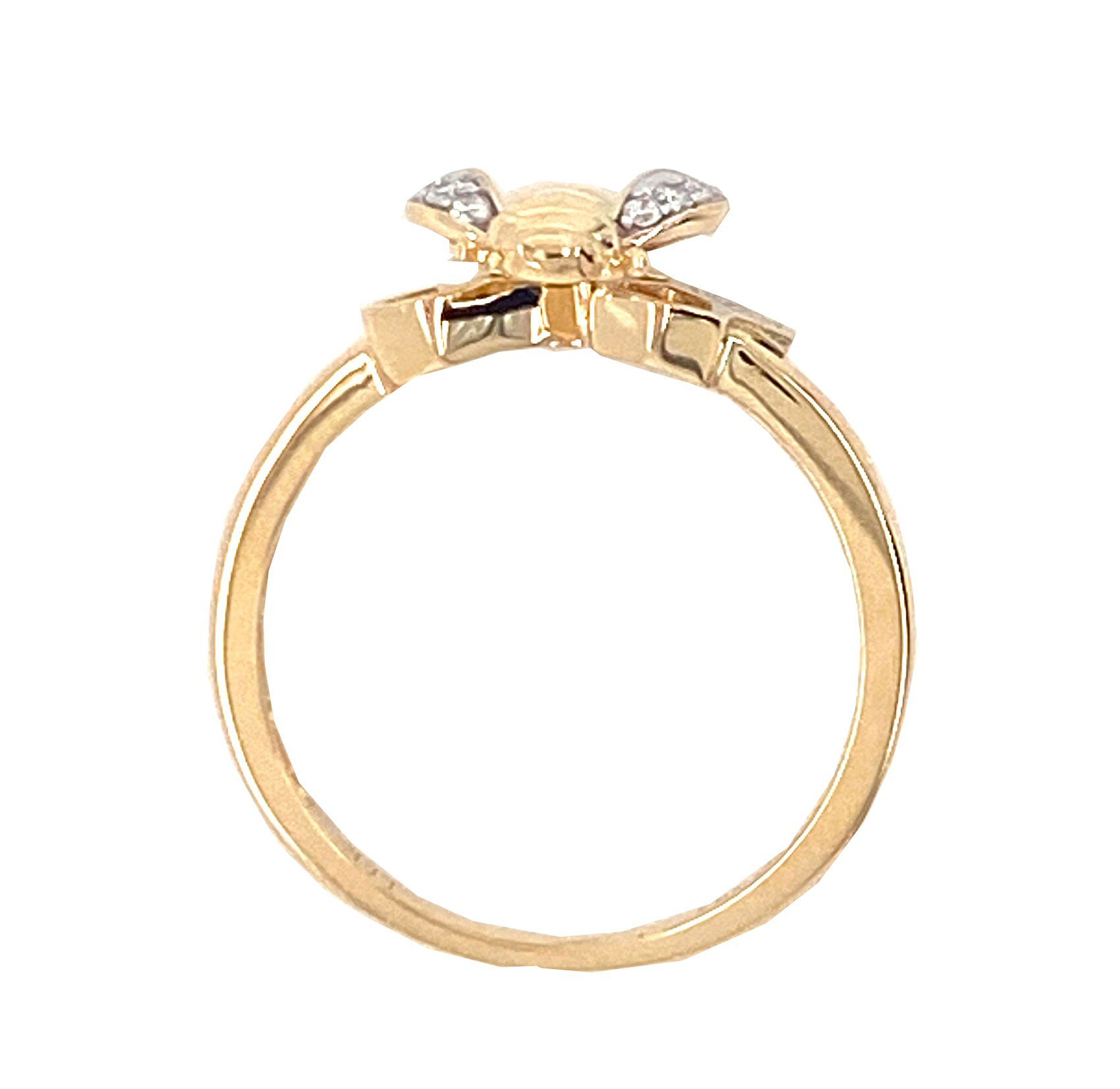 14 karat yellow gold bumblebee ring with .06 cttw diamonds. There are prong set round brilliant cut diamonds in the wings of the bee and in the honeycomb it is next to. So cute!