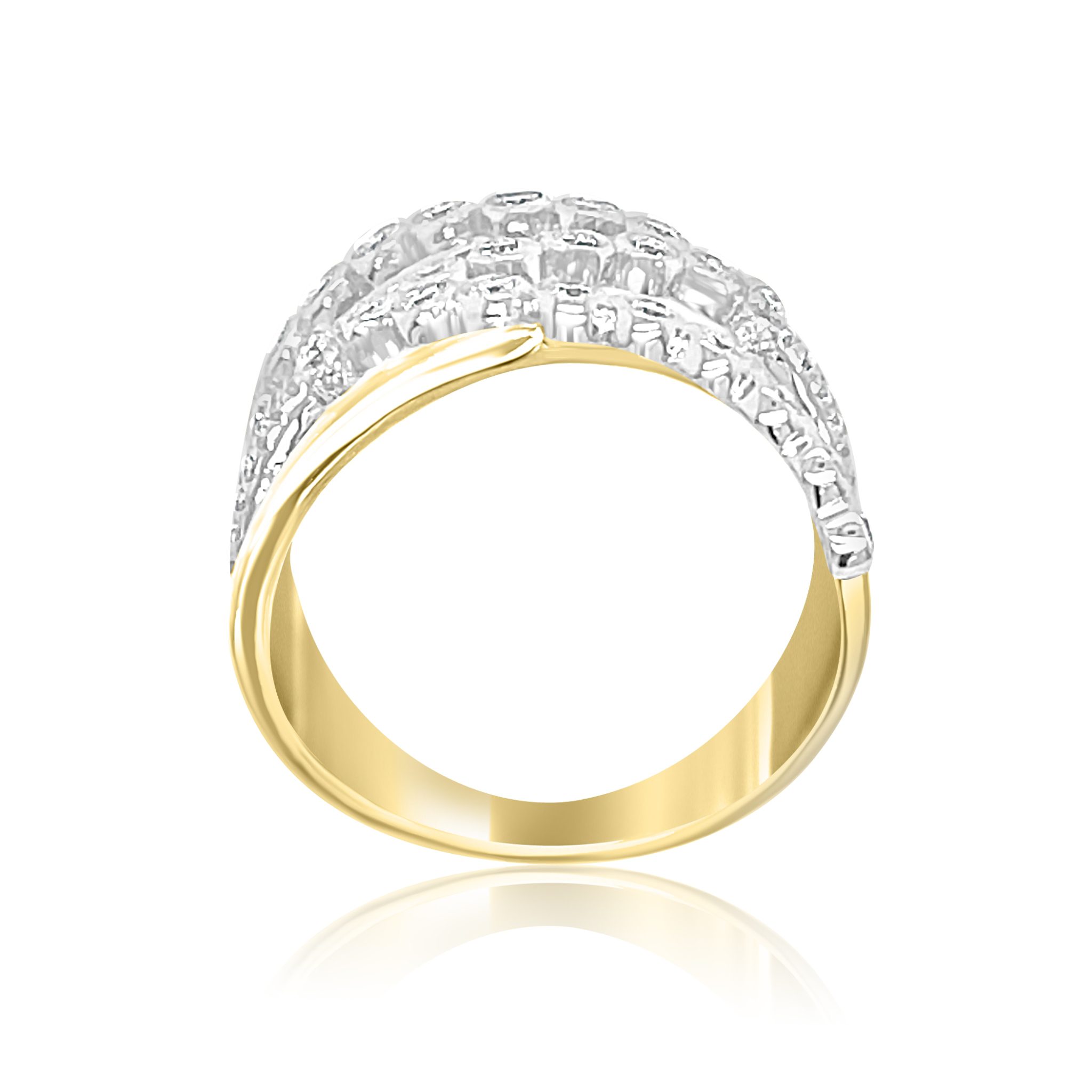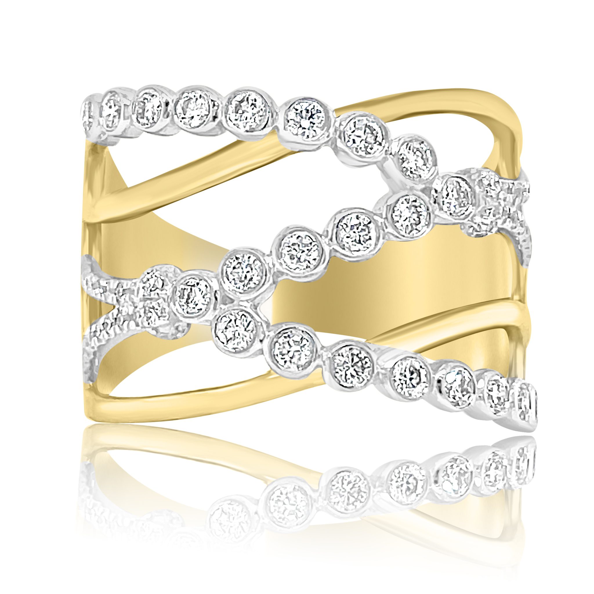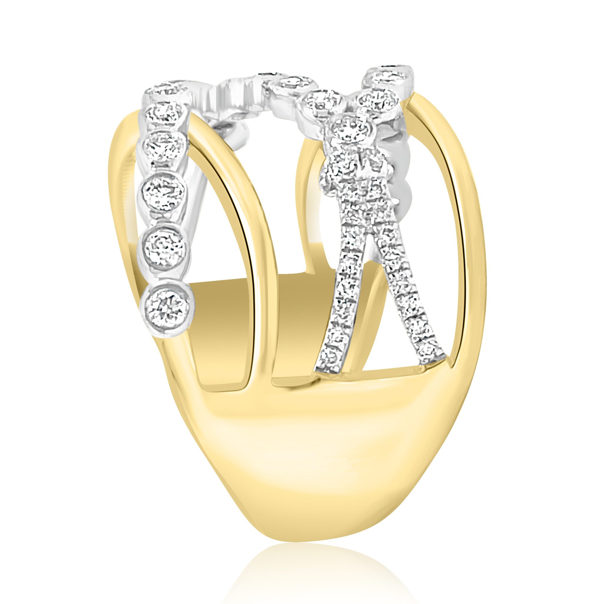 Extravagant 14 karat two-tone criss-cross diamond band with 0.48 cttw bezel set round brilliant cut diamonds.
