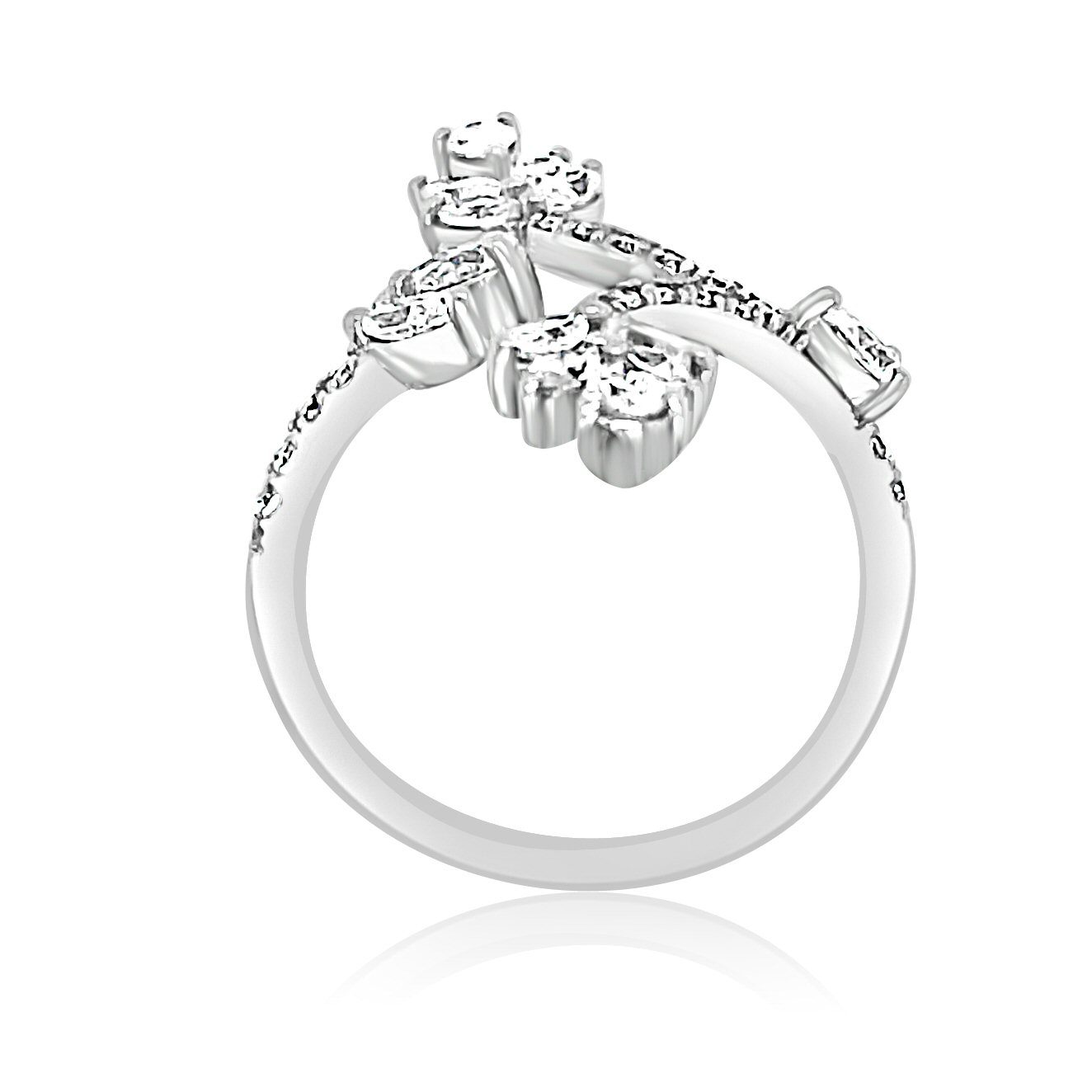 Gorgeous and uniquie18 karat white gold “open” style ring with 0.95 cttw of pear shaped, marquis, and round brilliant cut diamonds. There are 2 long “branches” on one side, elongating your finger, and a shorter “branch” on the other side reaching in between the other 2 branches.