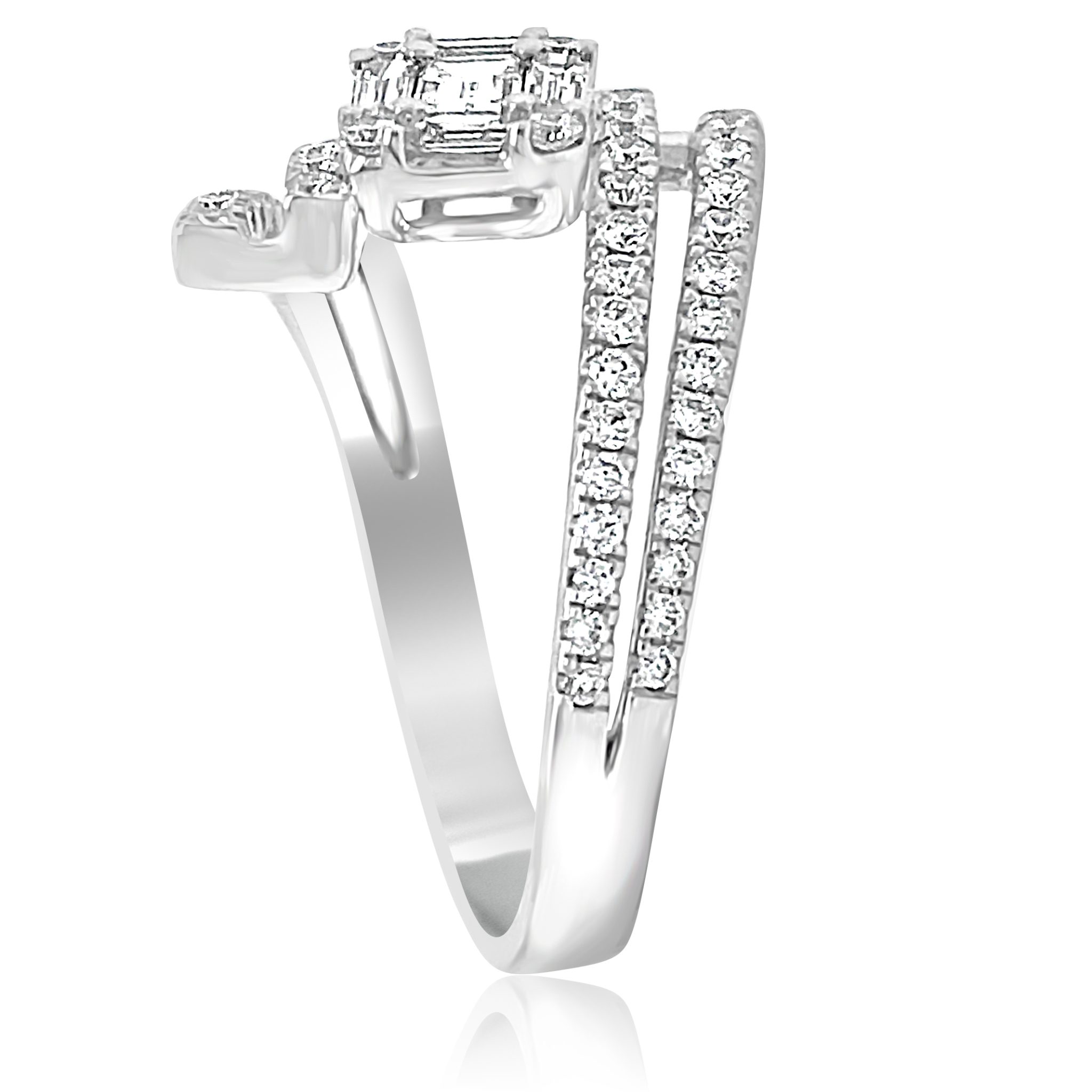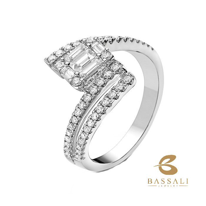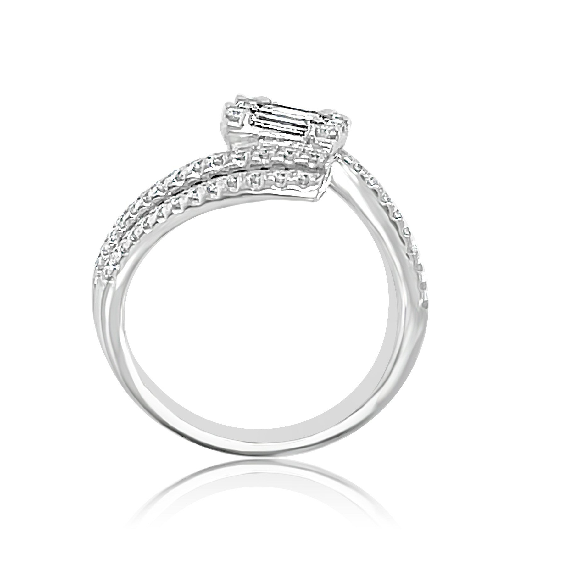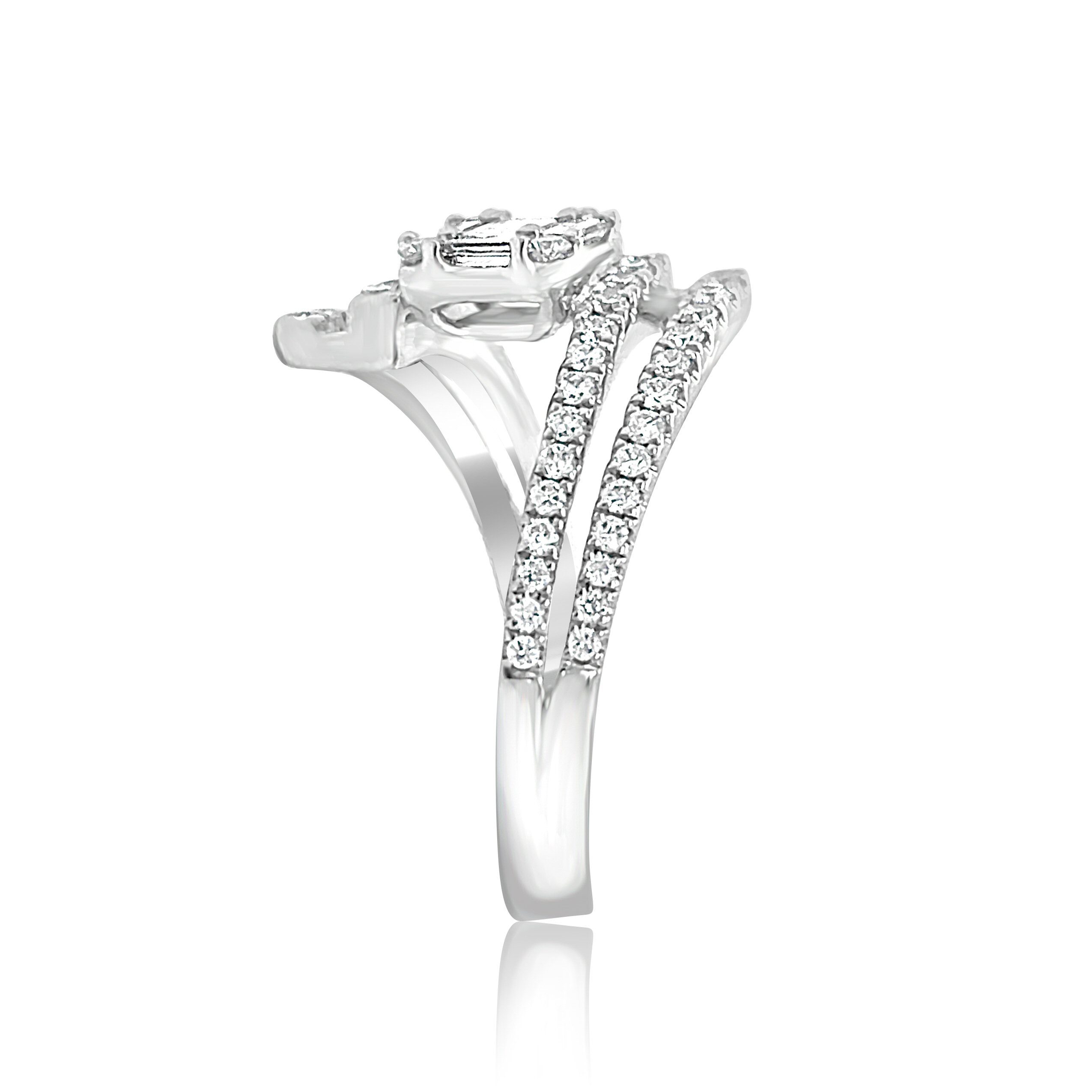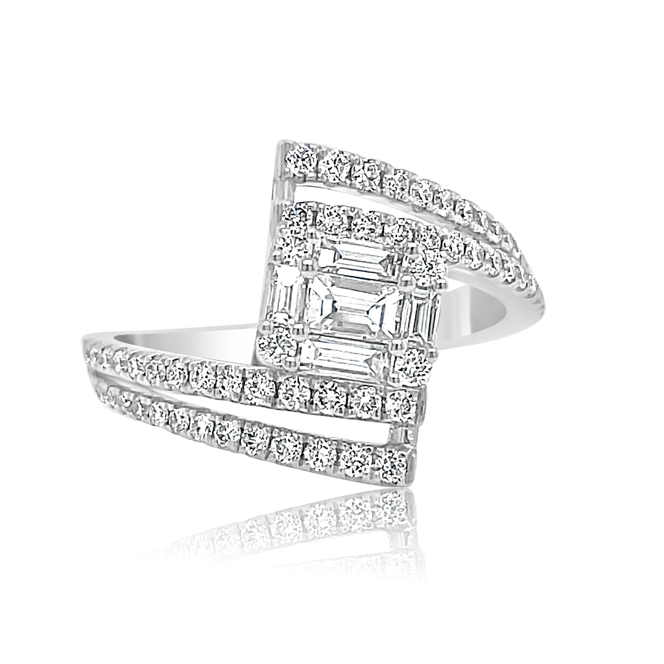 Very different 18 karat white gold bypass ring with 0.83 cttw diamonds .that include 0.39 cttw baguettes and 0.44 cttw rounds