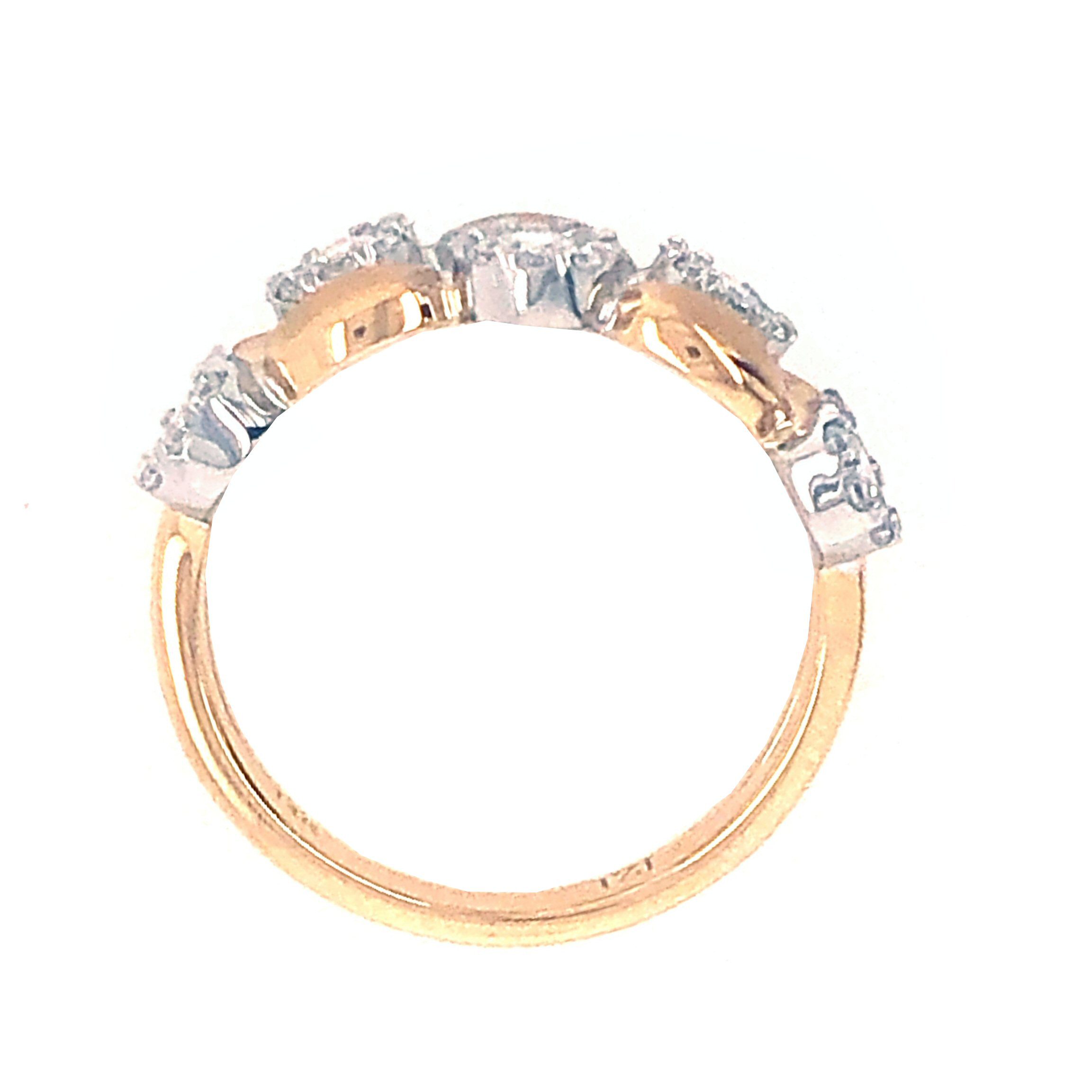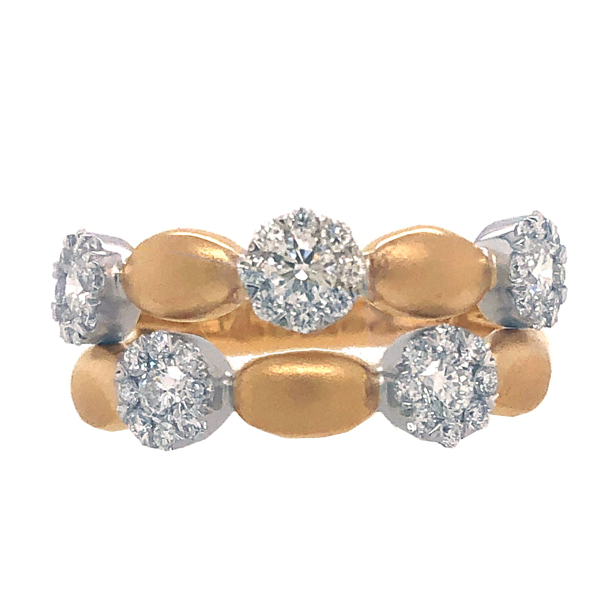 14 karat yellow and white gold 0.64cttw. diamond ring. The 0.64cttw. diamonds are invisibly set in 5 different white gold clusters. They are a bright, white contrast to the yellow gold oval bars between them that have been satin finished. Rich looking,unique and beautiful.