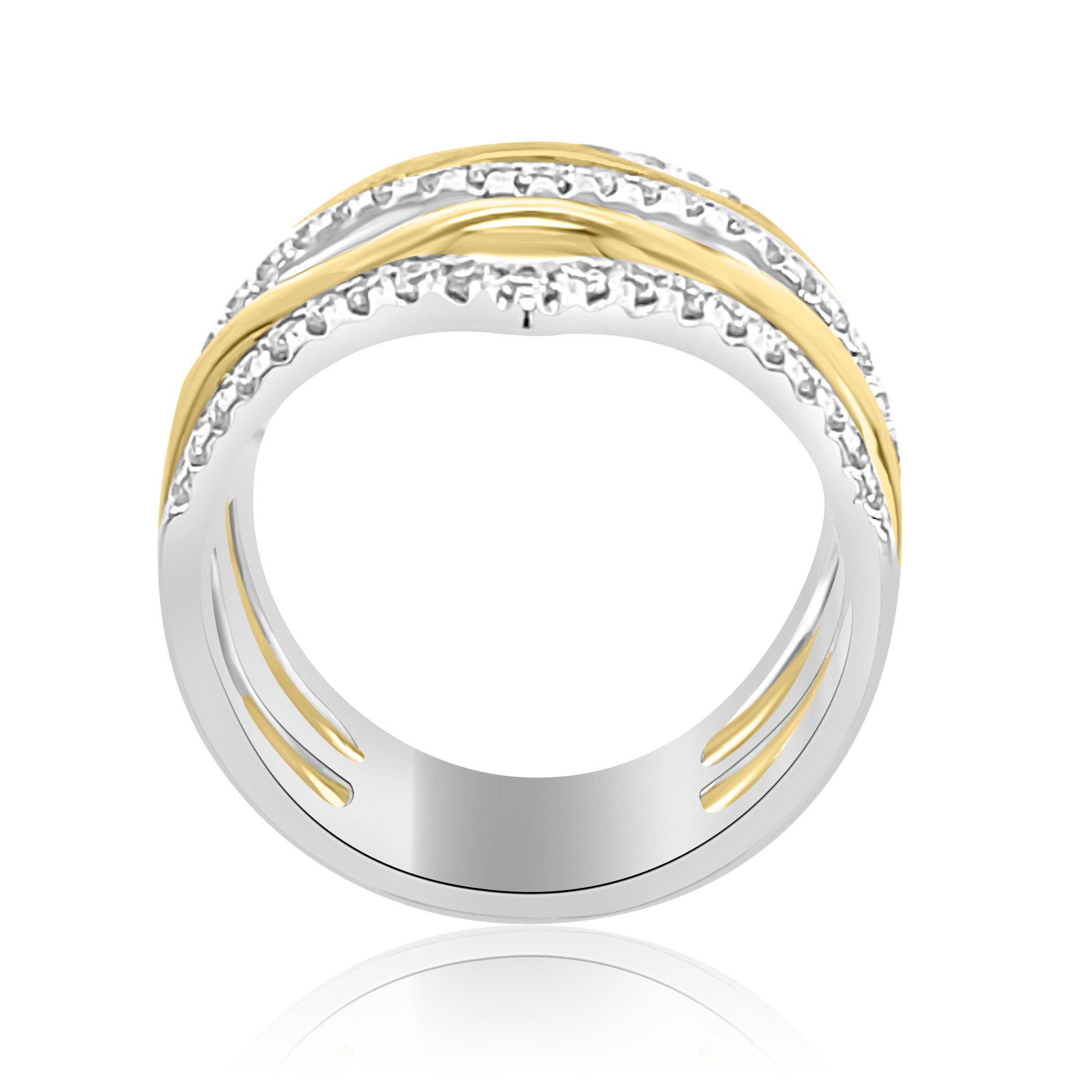 14 karat yellow and white ring with 0.70 cttw round brilliant cut diamonds. The diamond bands come to a “peak” and the gold parts swoop underneath the diamonds. Absolutely stunning and unique. This ring is 20mm wide.