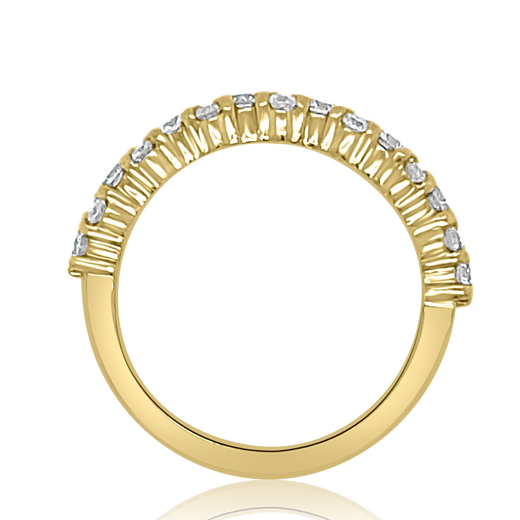 14 karat yellow gold 0.83cttw diamond band. The diamonds are prong set in a pattern that gives the band interesting dimension. There are (8) 0.07ct round brilliant cut diamonds that are separated by (2) vertically set, 0.02ct diamonds. All of the diamondsare SI clarity and G-H in color.