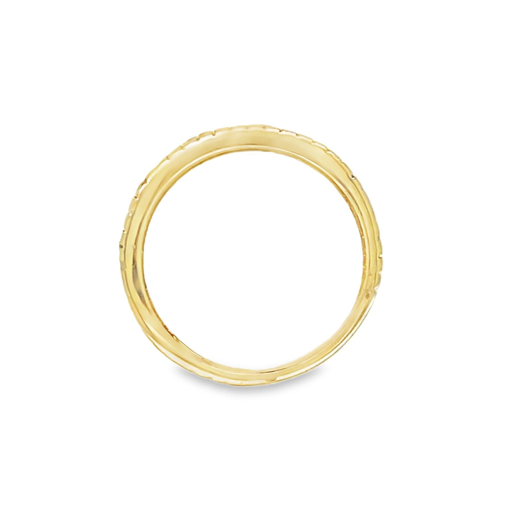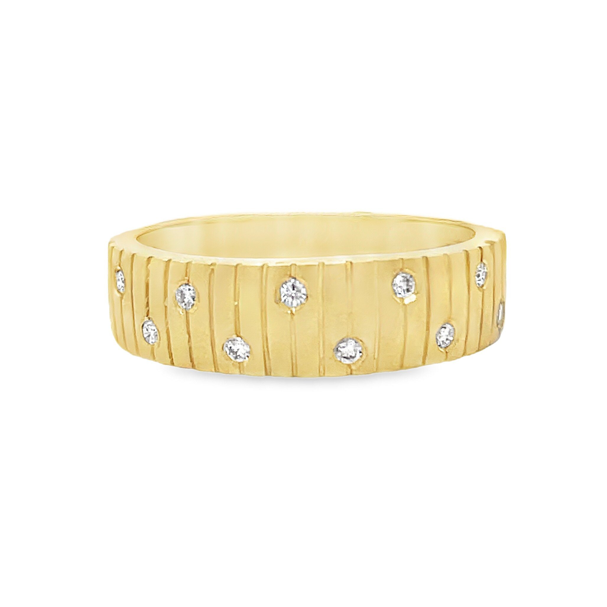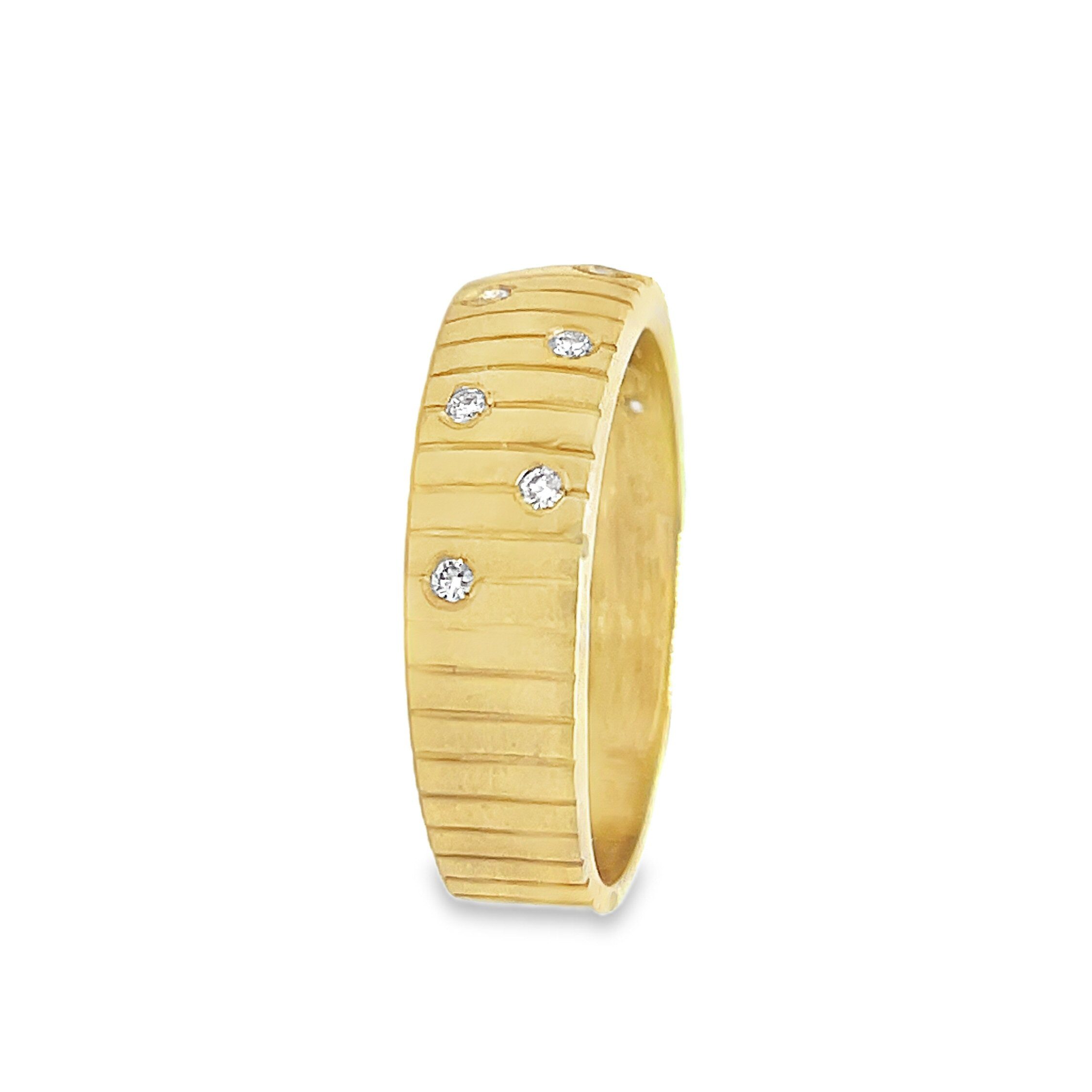 14 karat yellow gold 5mm wide ribbed band with 0.10cttw flush set round brilliant cut diamonds. Round brilliant cut diamonds are SI clarity and H-I color.