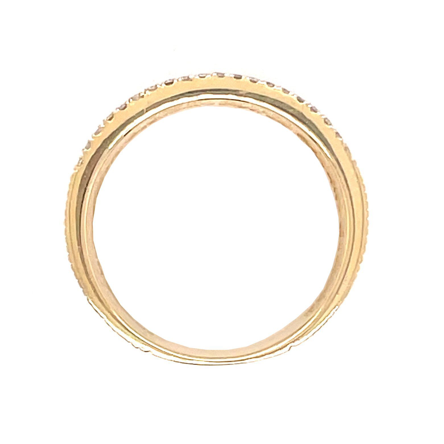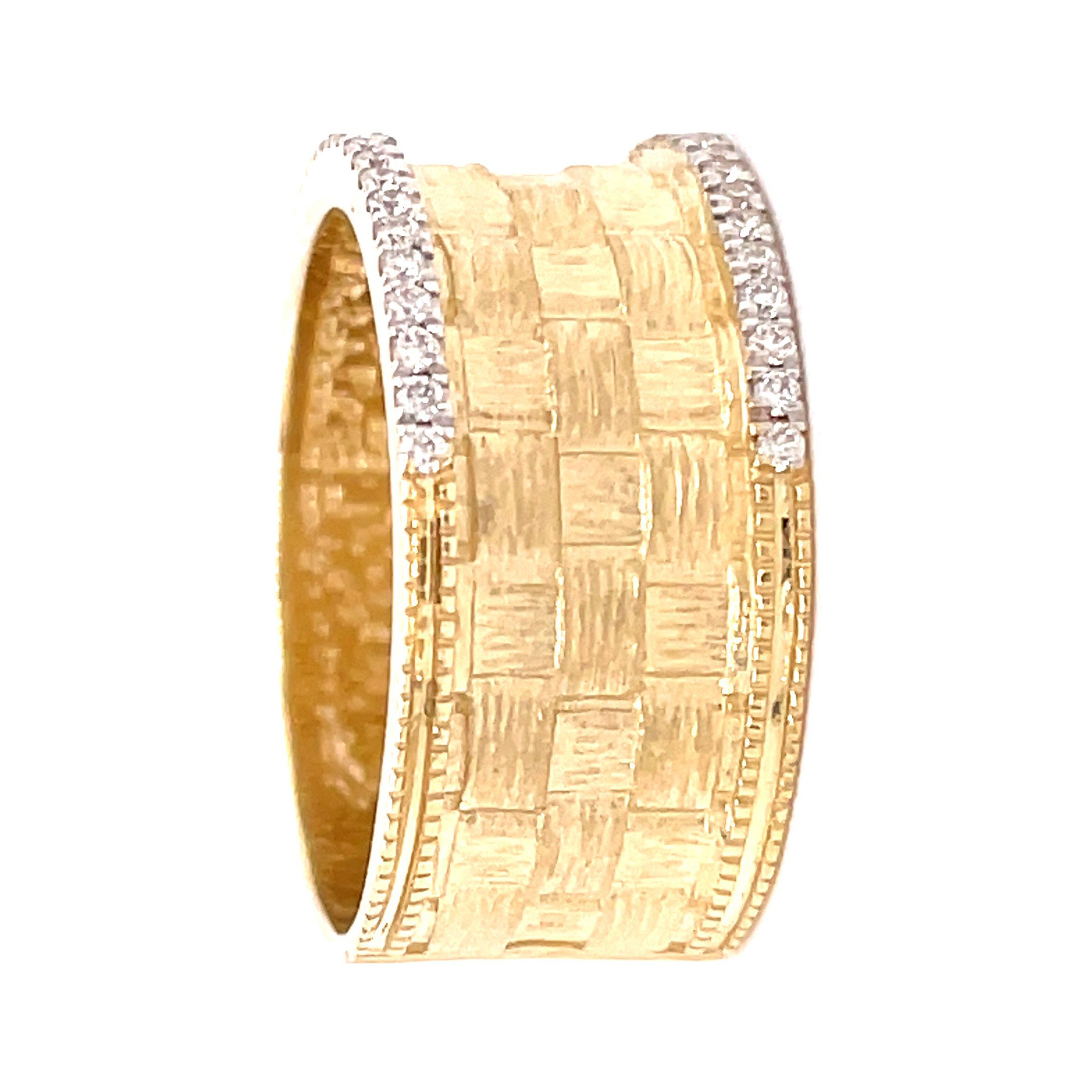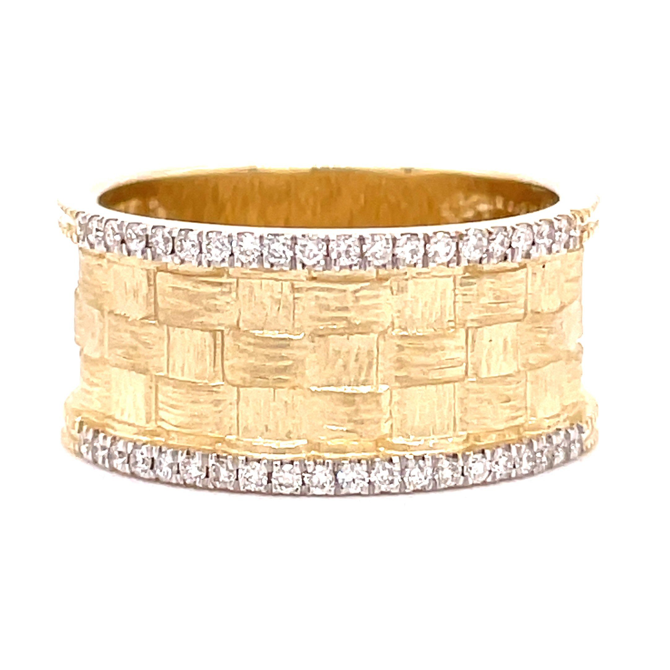 14 karat yellow gold 9.5mm wide band with 0.20 cttw diamonds. The band is a wide basket weave style with a row of prong set round brilliant cut diamonds on each side, setting off the design. Round brilliant cut diamonds are SI clarity and H-I color.