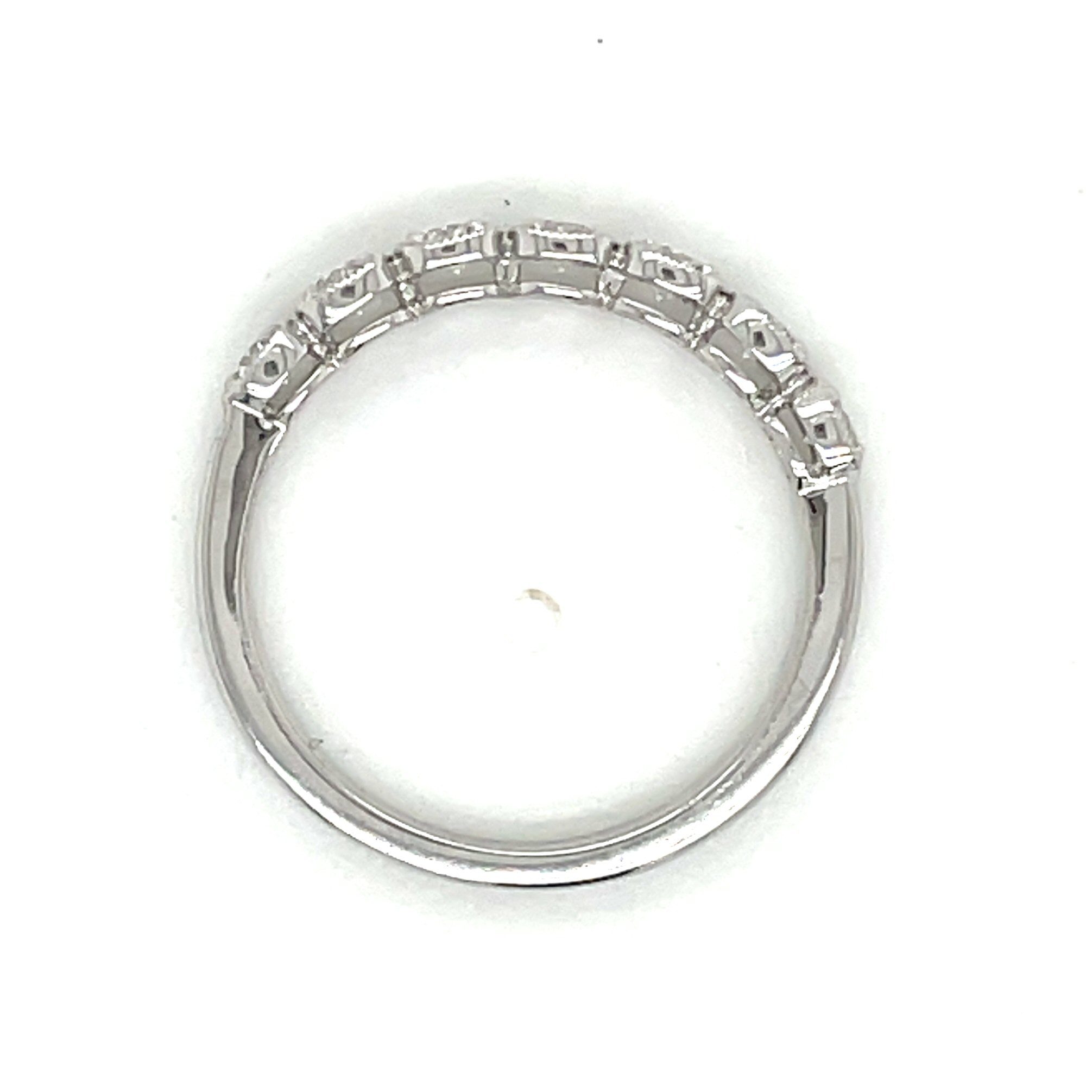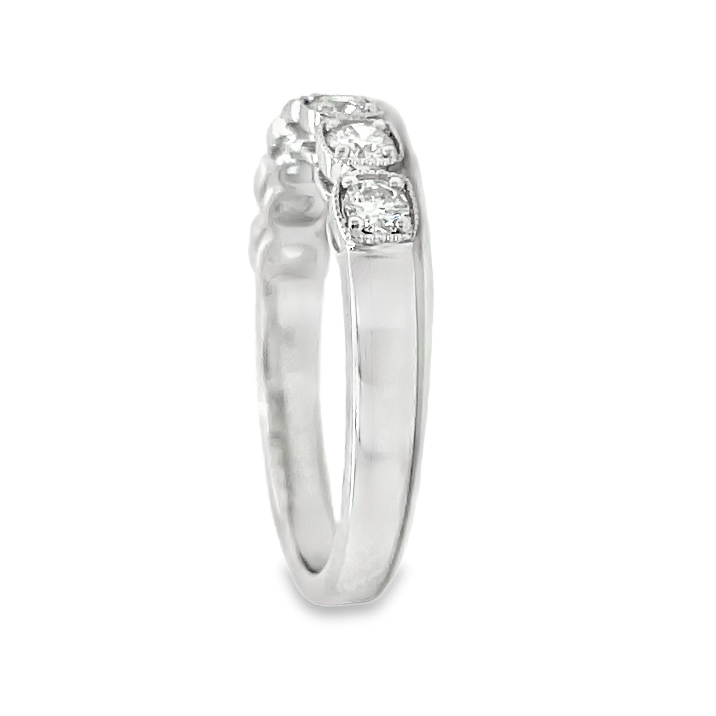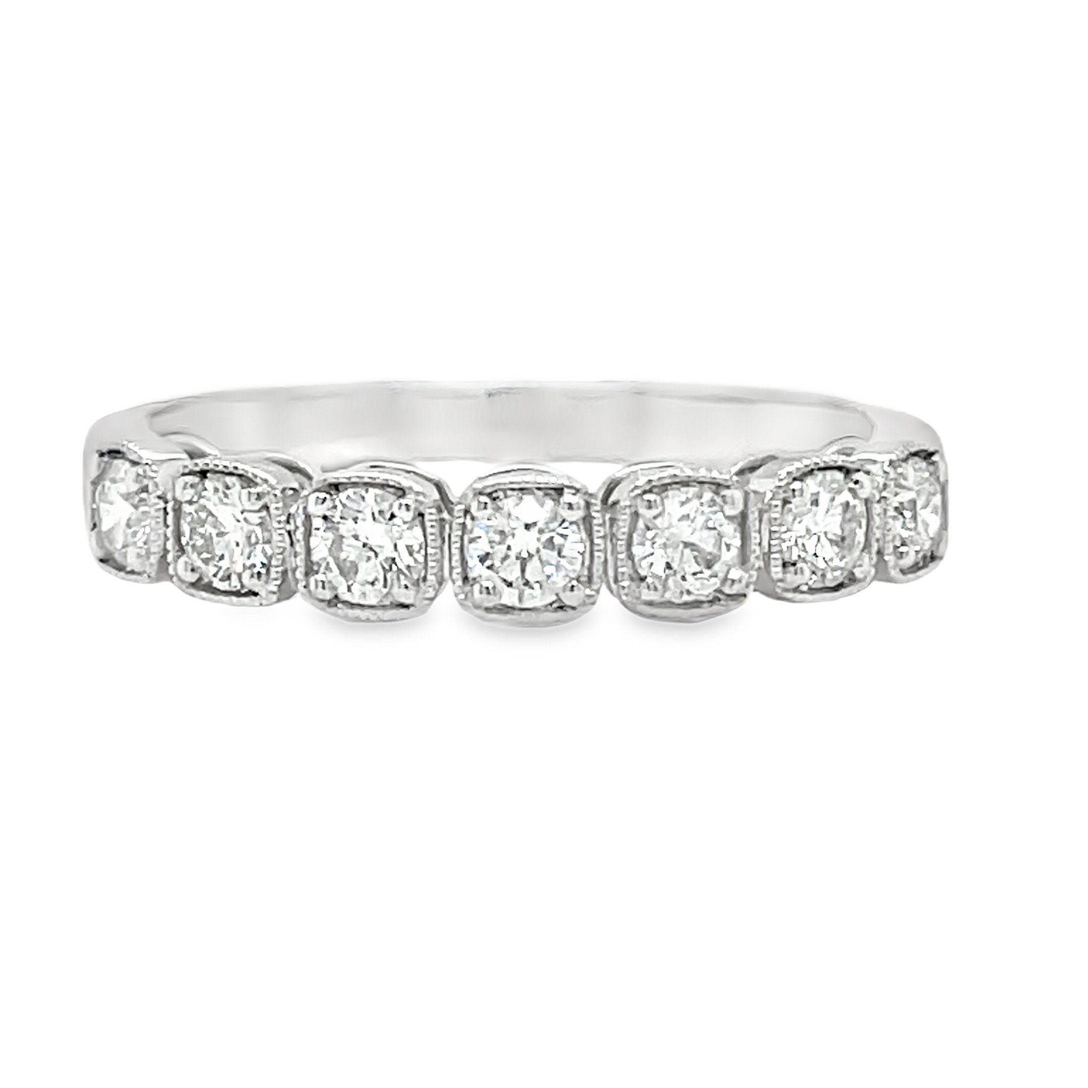Gorgeous 14 karat white gold 0.46cttw diamond band! There are 7 prong set diamonds in a straight line with milgrain edging around each diamond separately like a halo. All the diamonds are VS clarity, F-G color.