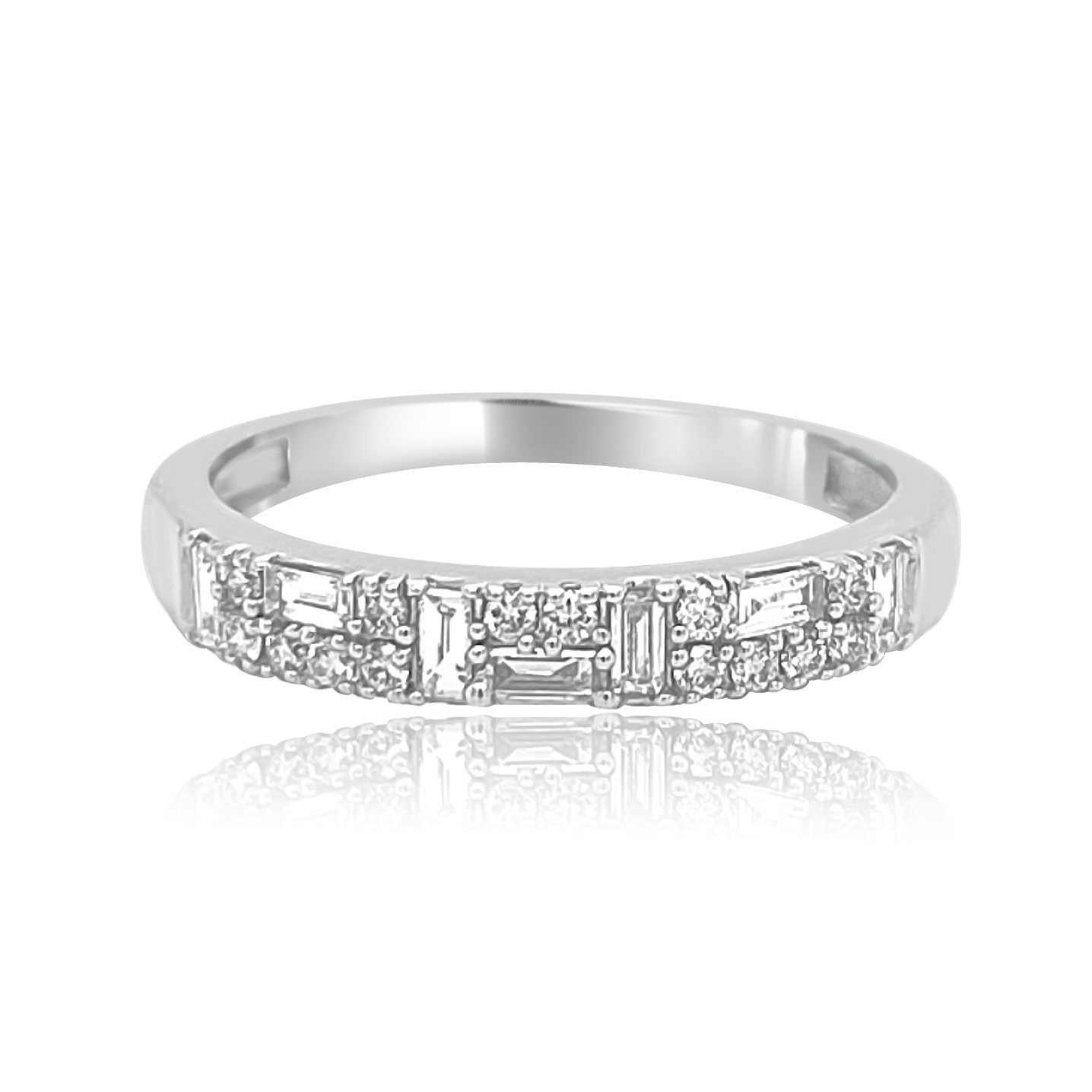 14 karat white gold band with 0.33 cttw baguette and round brilliant cut diamonds. There are seven baguette cut diamonds prong set in a unique configuration between the round diamonds giving the band flashes of sparkle from the different shaped SI clarity, G-H colored diamonds.