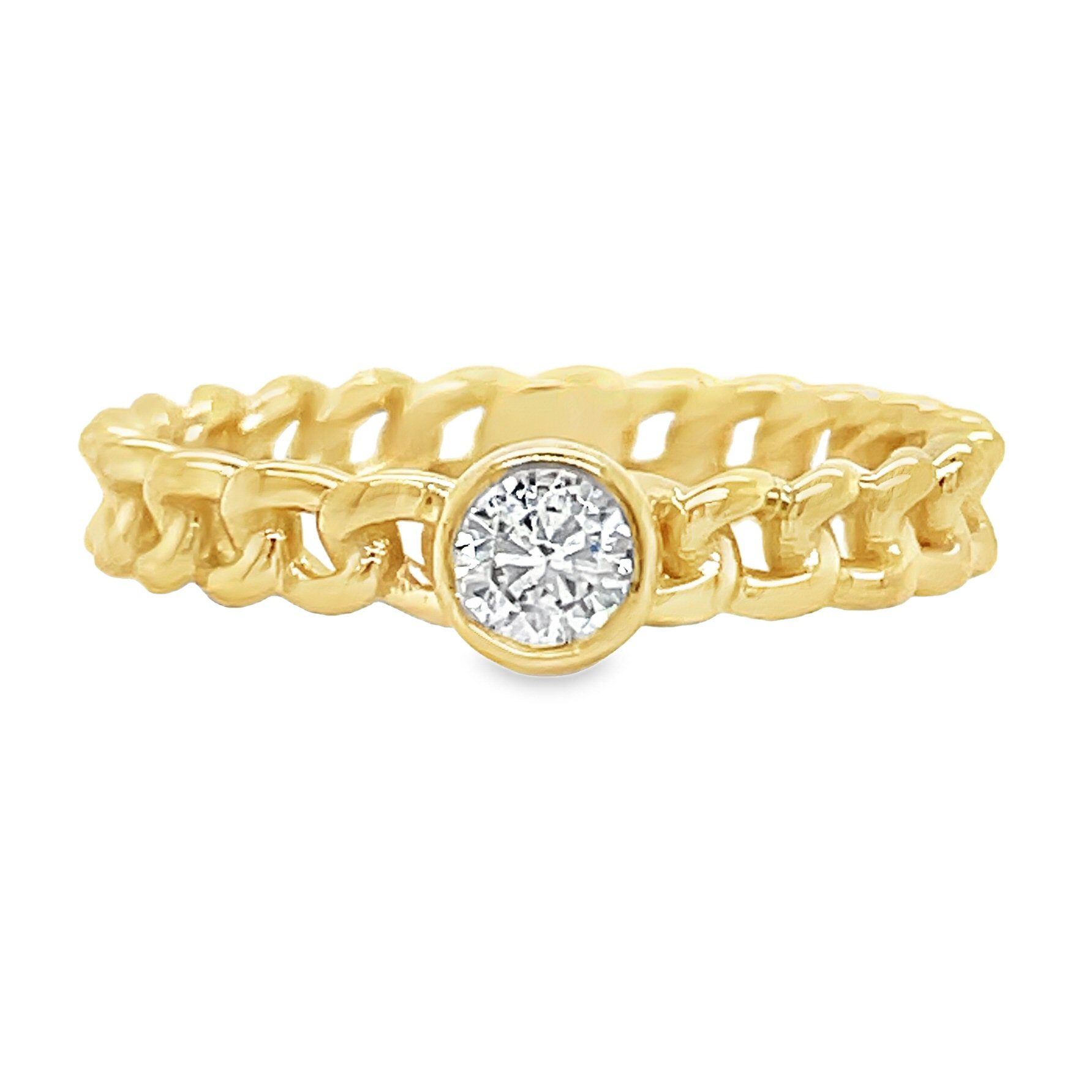 14 karat yellow gold chain link style band with one 0.20 carat round brilliant cut, bezel set diamond. The bezel is 14 karat white gold and the diamond is SI clarity, G-H color.