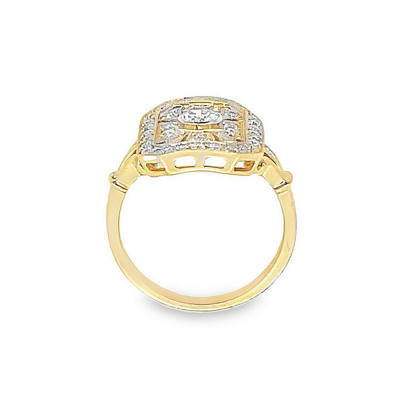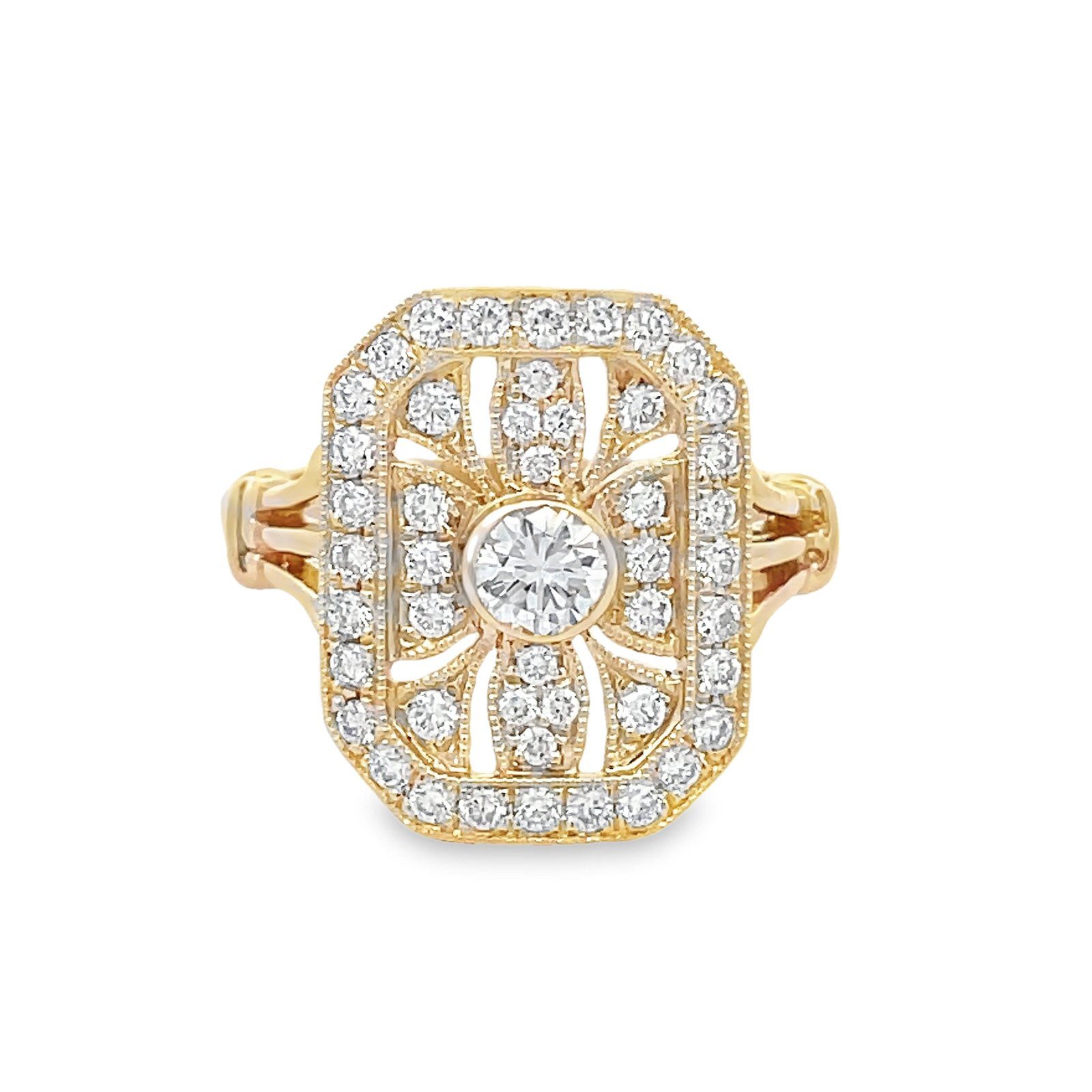14 karat yellow gold 0.77cttw diamond rectangular shaped ring. The center diamond is a 0.22ct round brilliant cut diamond of VS1 clarity and G-H color. It is accented beautifully in this vintage looking ring with 0.55cttw round brilliant cut diamonds of VS clarity and F-G color.