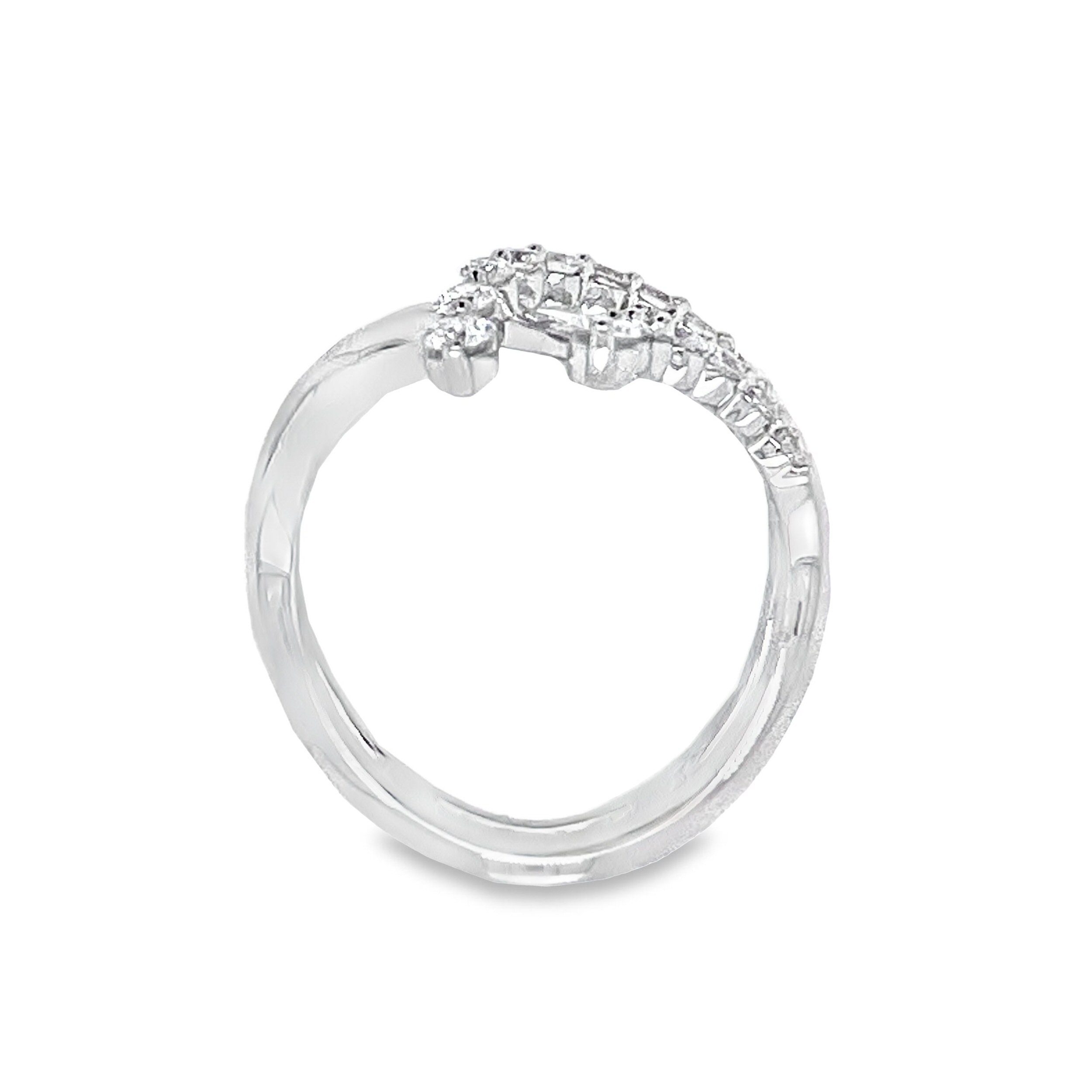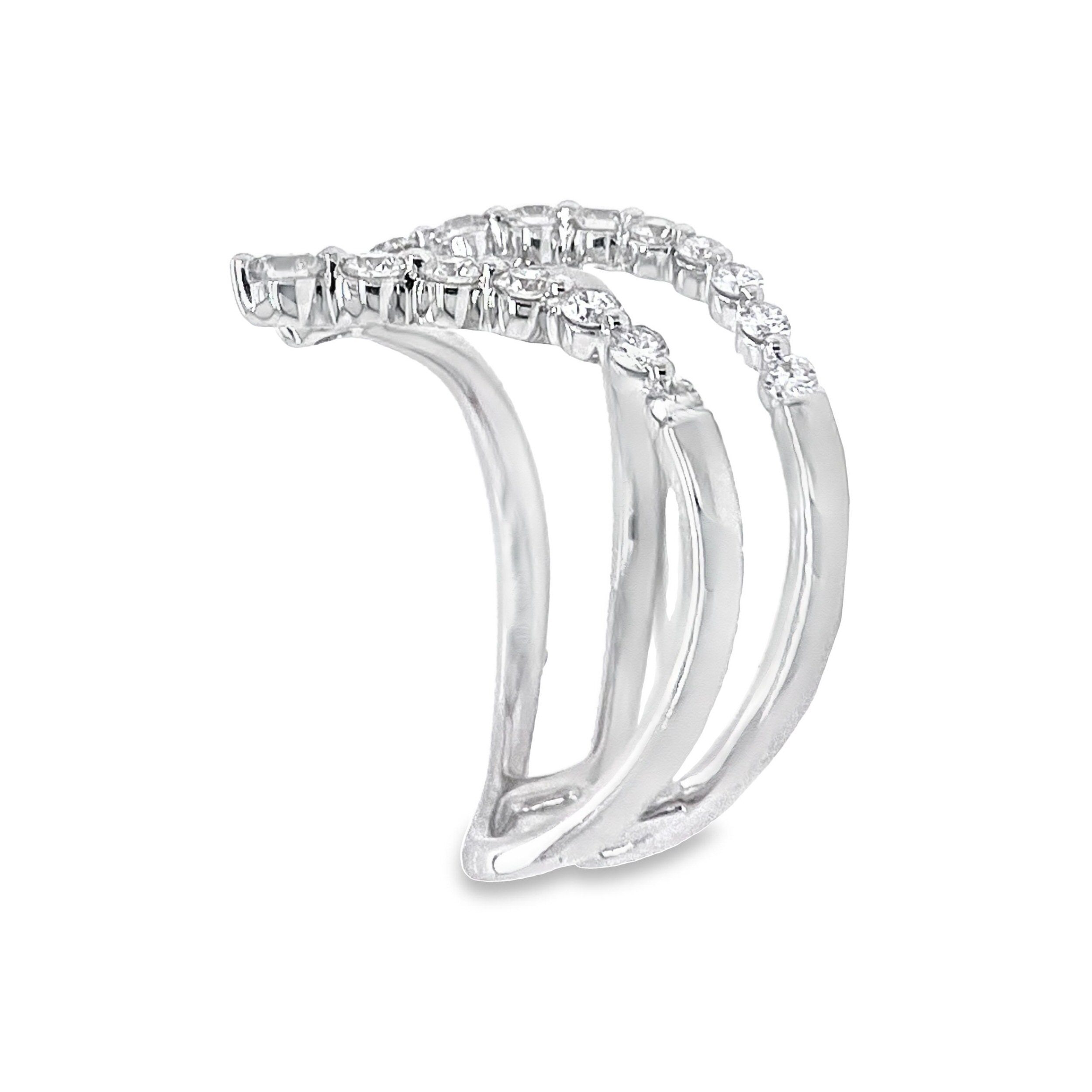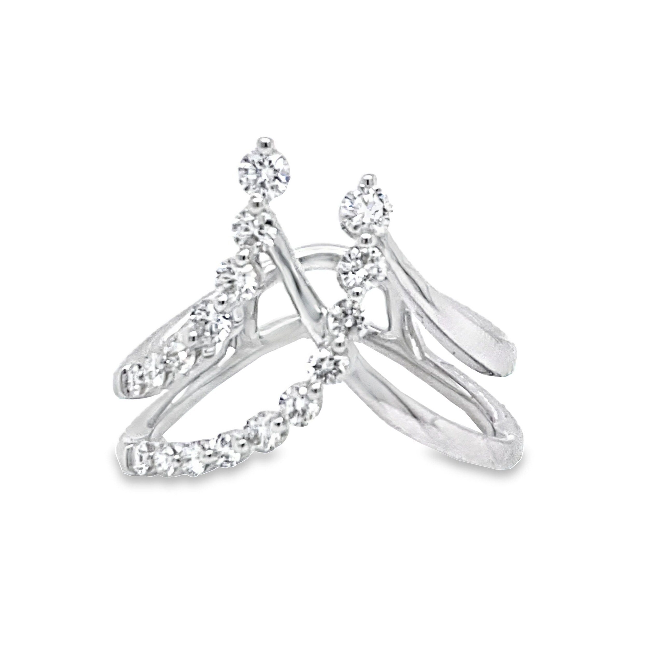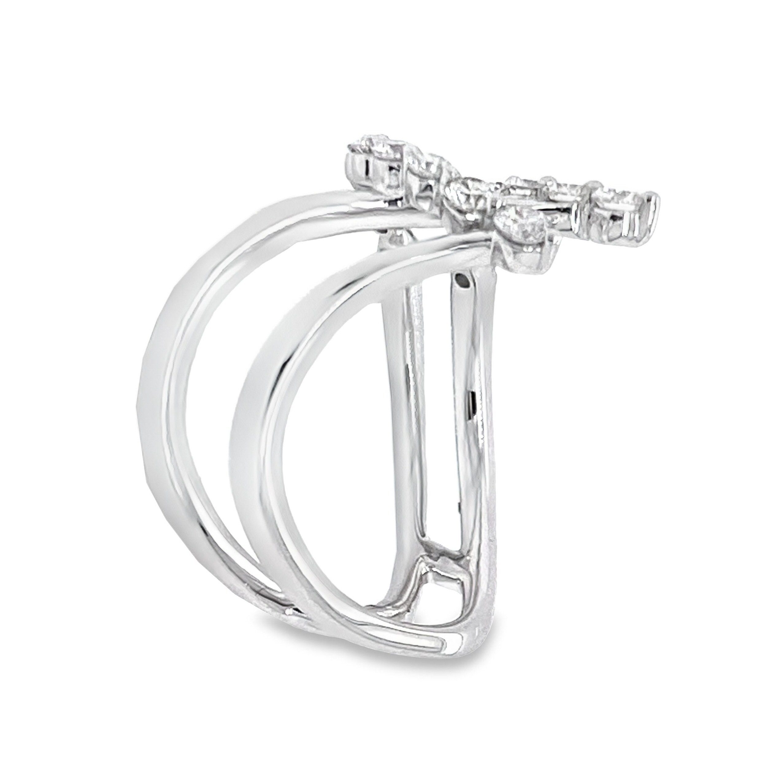 14 karat white gold ring with .58cttw round brilliant cut diamonds. The ring is a double V with two rows of prong set diamonds crossing over two high polished white gold bars. The diamonds are SI clarity and G-H in color making this a brightly sparkling unique ring.