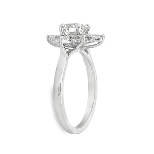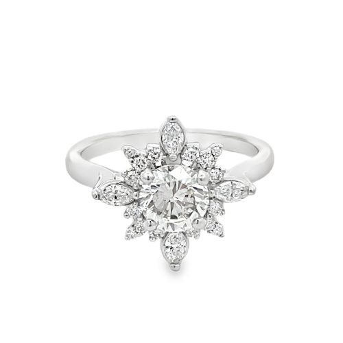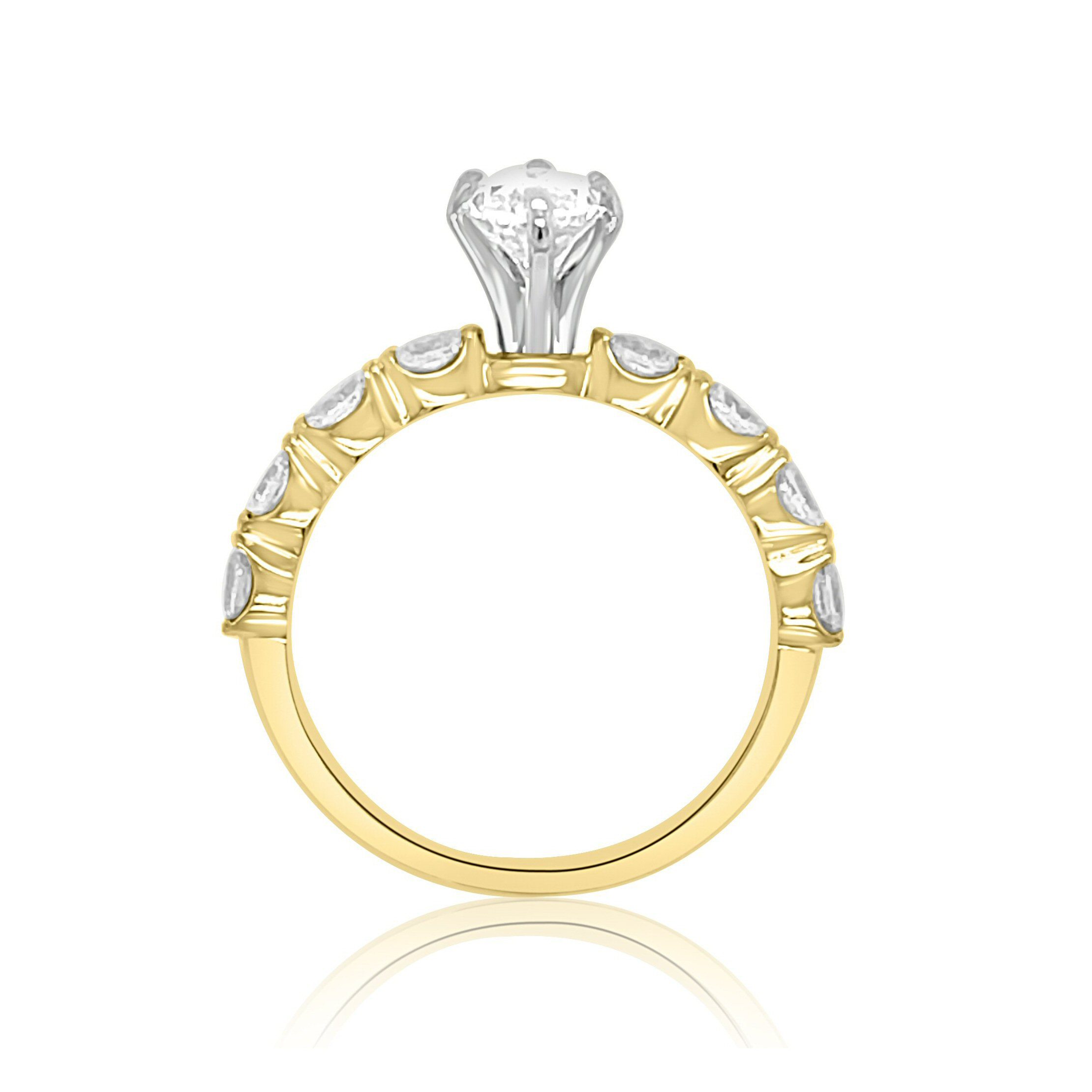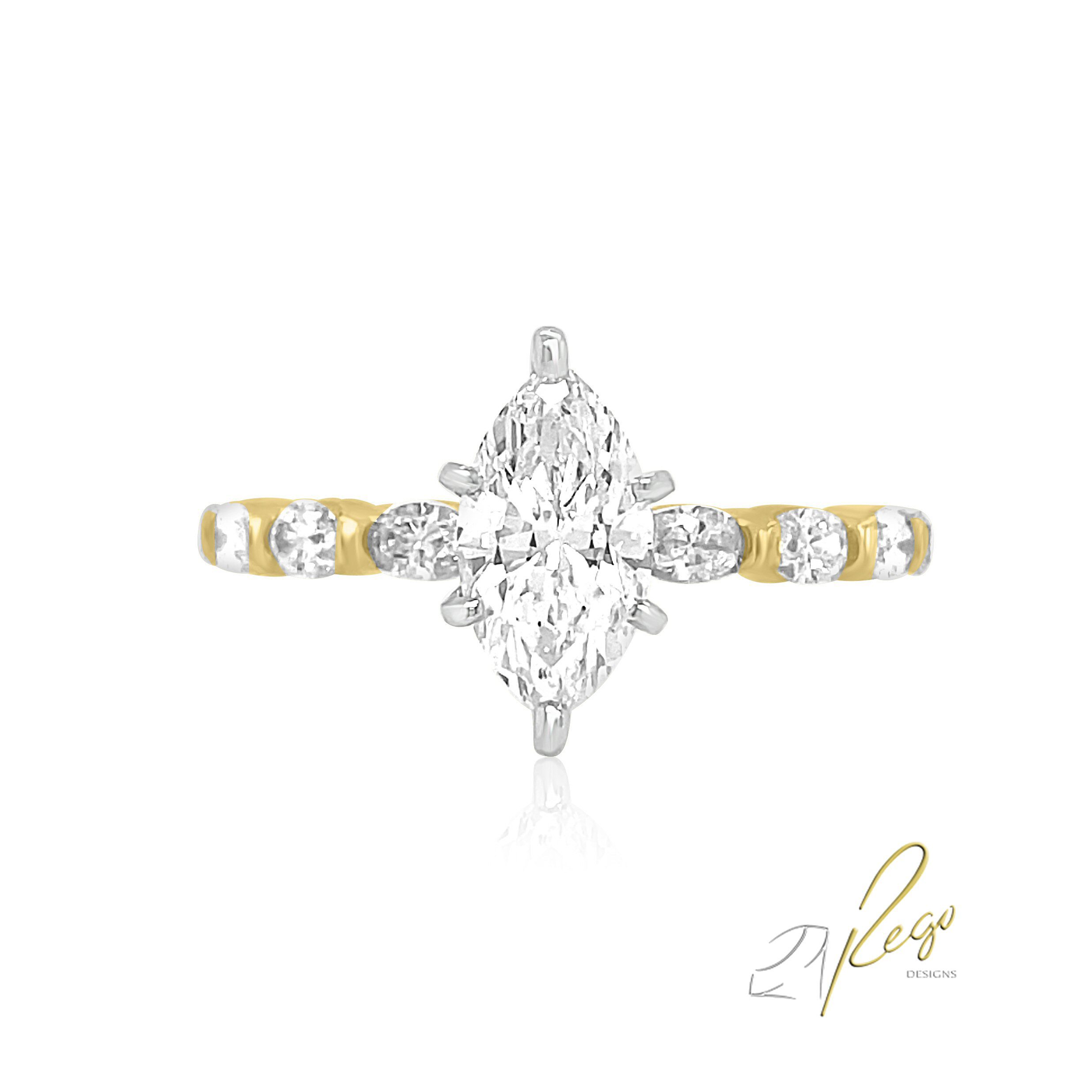 14 karat yellow gold 1.71cttw diamond engagement ring. The center stone is a 1.08ct marquise cut diamond of SI1 clarity and E color and is certified as such by Gemological Institute of America, certificate #7376913897.There are 0.63cttw oval cut diamondsof SI clarity and G-H color, set east-west on both sides of the marquise. Matching band is style #19605. The center diamond may be purchased separately for $7,700.