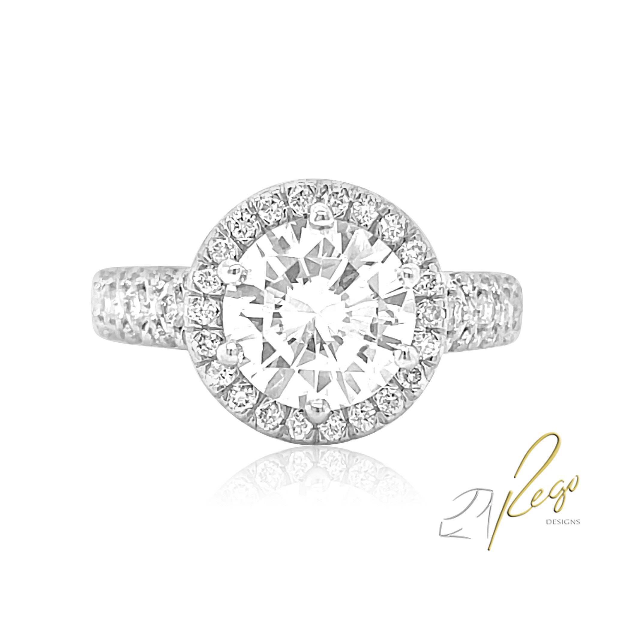 Stunning 2.44cttw diamond ring. The center stone is a 2.01 carat round brilliant cut diamond of VS2 clarity and G color and is certified as such by Gemological Institute of America, certificate #6223308062. There are 0.43cttw round brilliant cut diamondsprong set in a halo style ring with a vintage feel in the band. Unique and beautiful! The center diamond may be purchased separately for $30,000.