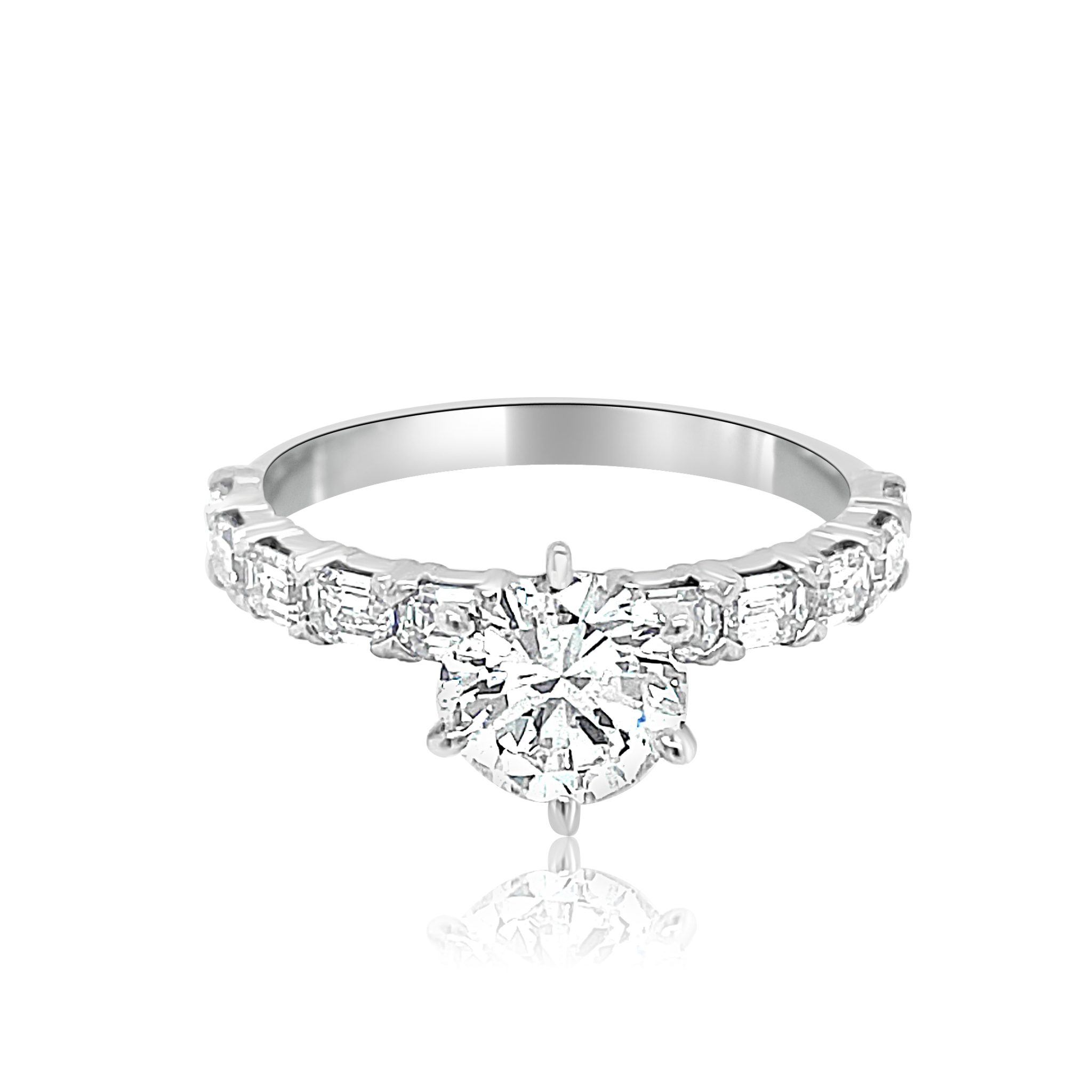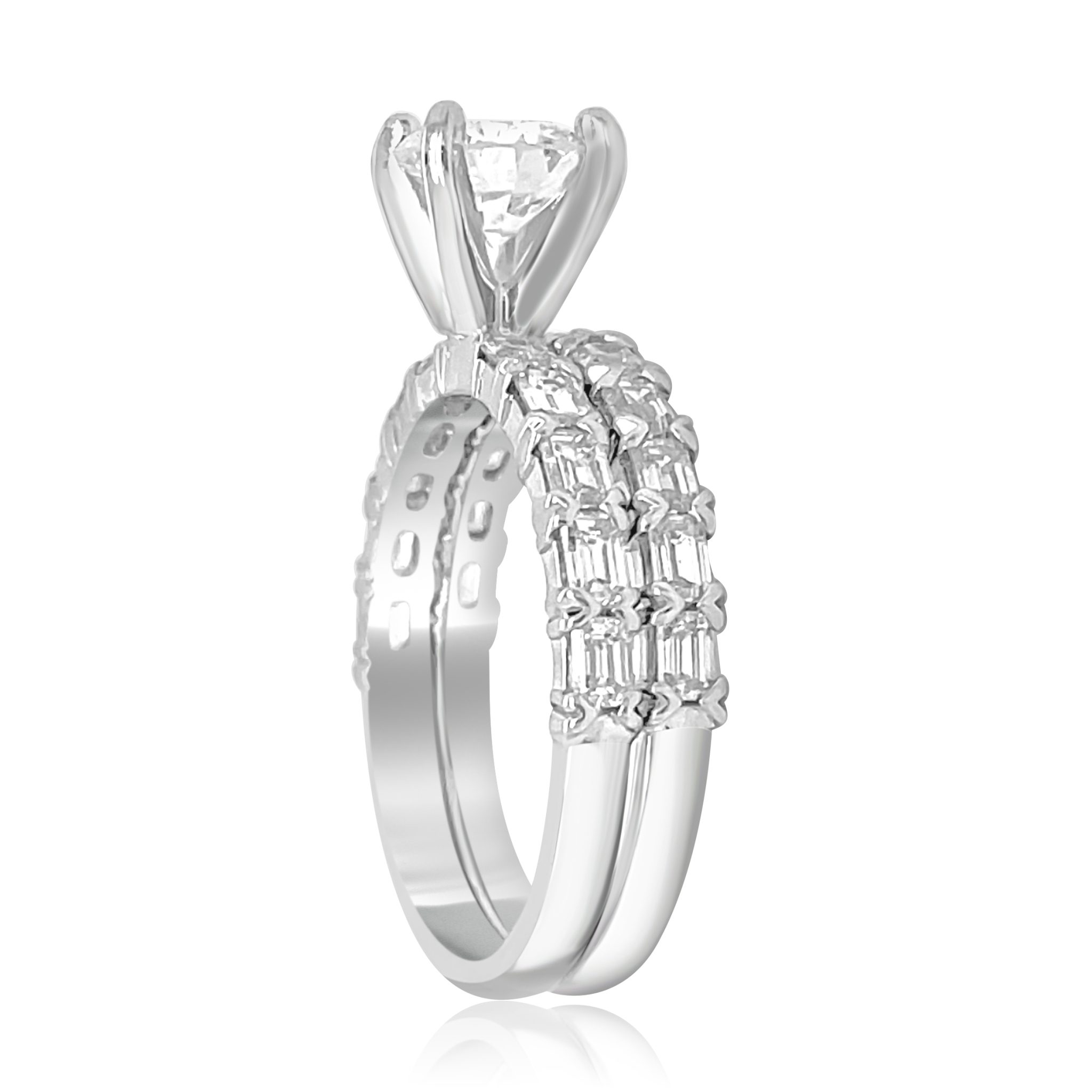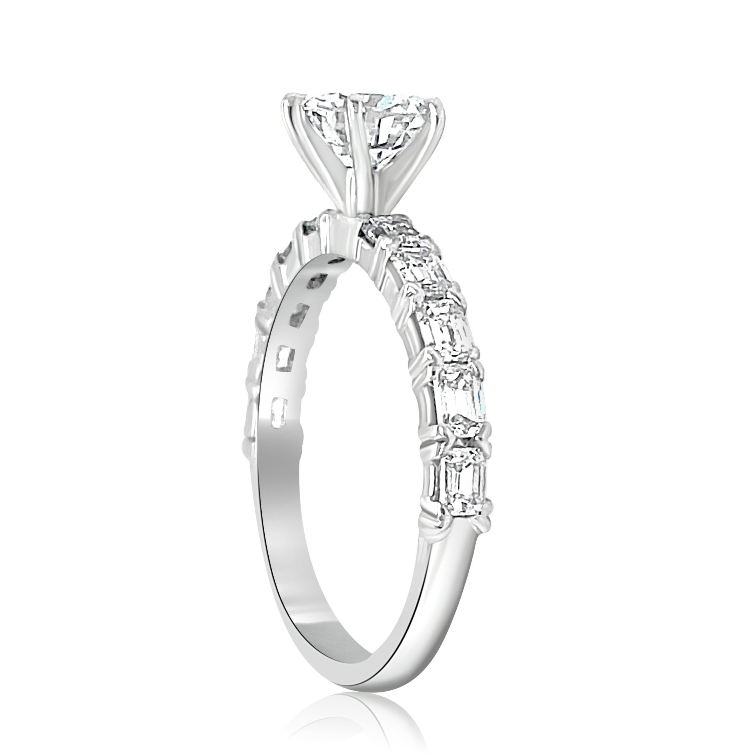 Absolutely stunning 14 karat white gold 1.8 cttw diamond ring. The center stone is a 1.17 carat round modified brilliant cut diamond of SI2 clarity and I color and is certified as such by Gemological Institute of America certificate #5221839493. There are 0.63cttw baguette cut diamonds on the band portion of the ring. There are five baguettes set East-West on each side of the center diamond. These diamonds are VS clarity and G color creating a simply elegant and gorgeous ring. The center diamond may be purchased separately for $9,200.