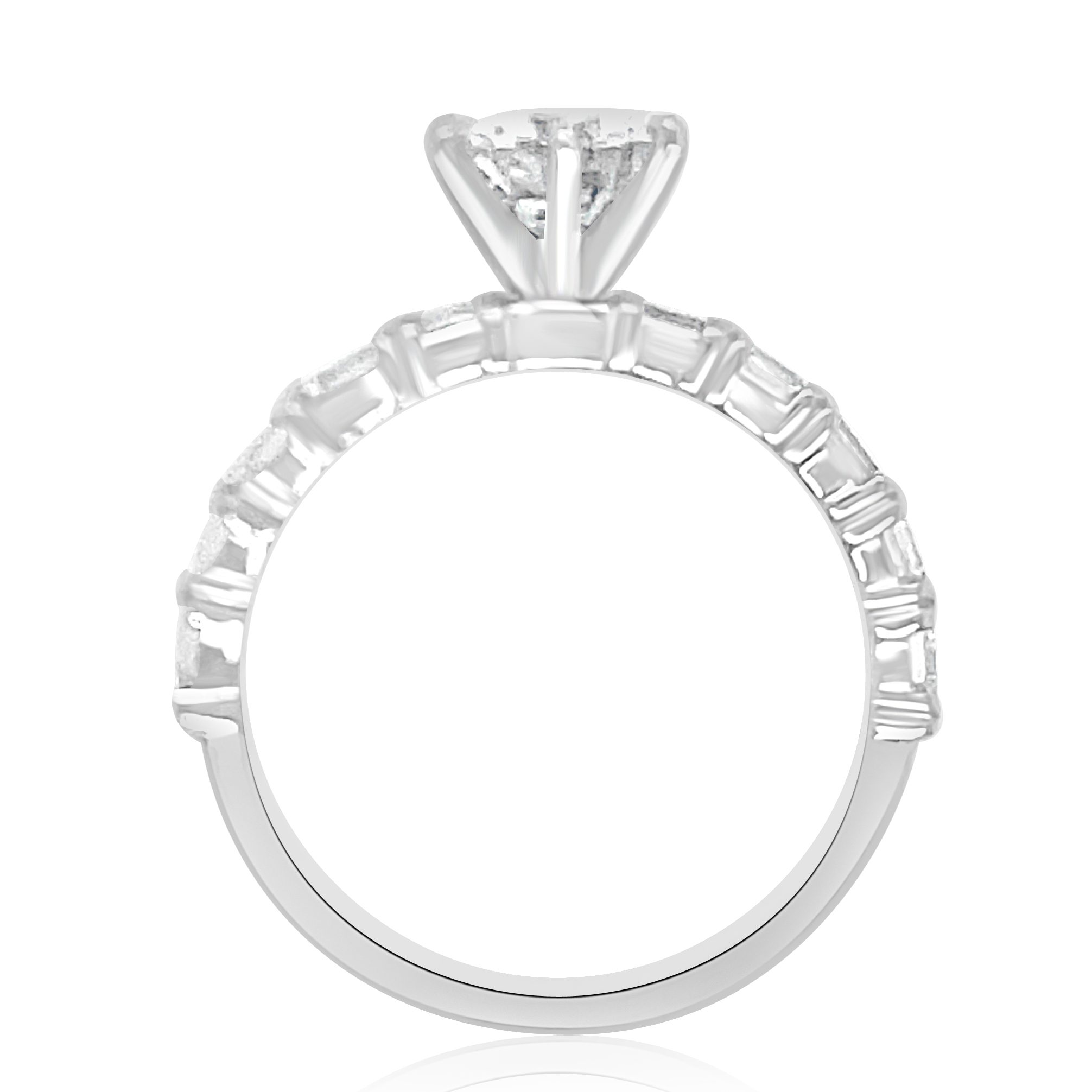 Absolutely stunning 14 karat white gold 1.63 cttw diamond ring. The center stone is a 1.0 carat round brilliant cut diamond of VS2 clarity and H color and is certified as such by Gemological Institute of America certificate #6234045959. There are 0.63cttw baguette cut diamonds on the band portion of the ring. There are five baguettes set East-West on each side of the center diamond. These diamonds are VS clarity and G color creating a simply elegant and gorgeous ring. There is also a matching wedding band! Style # RA-3198W. The center diamond may be purchased separately for $8,000.