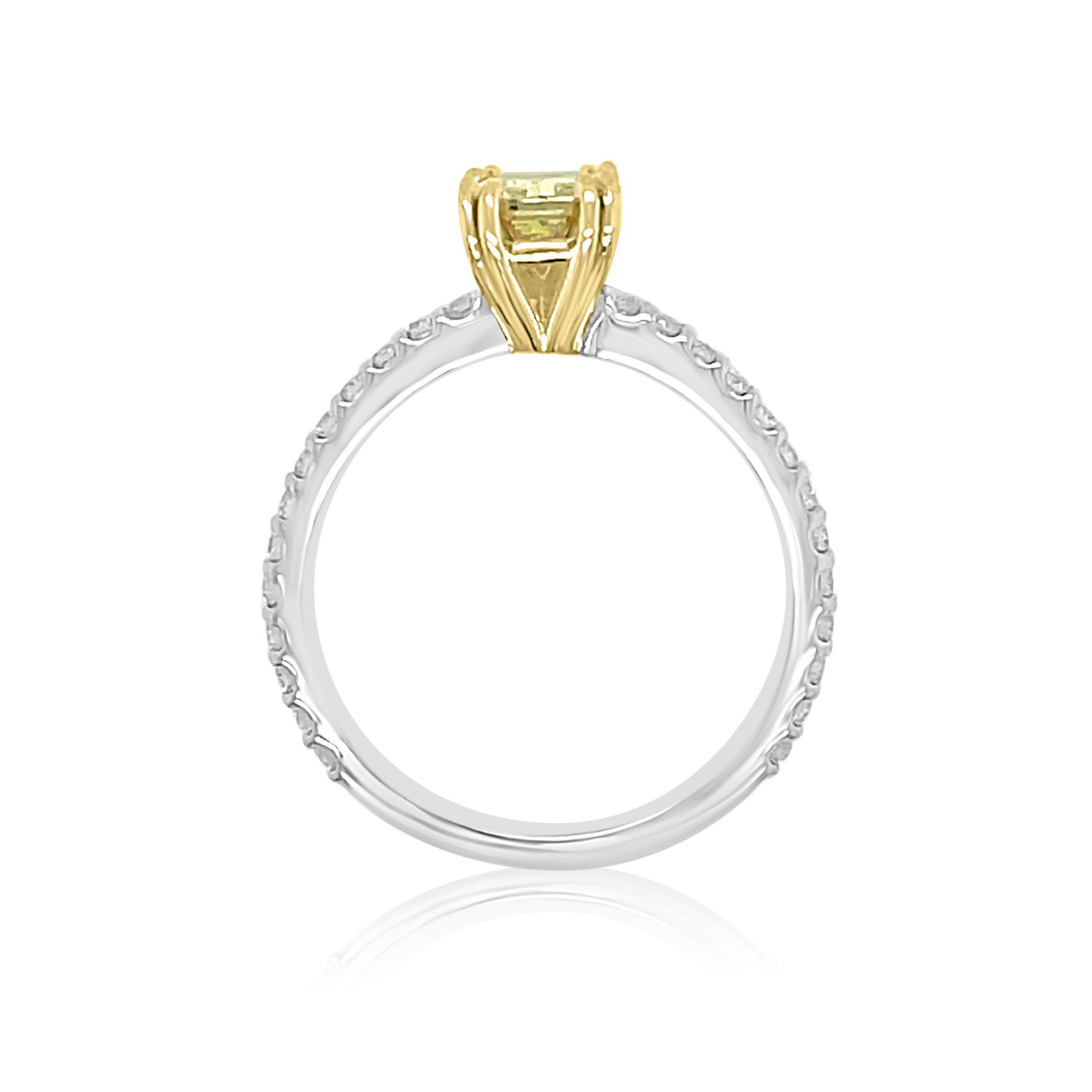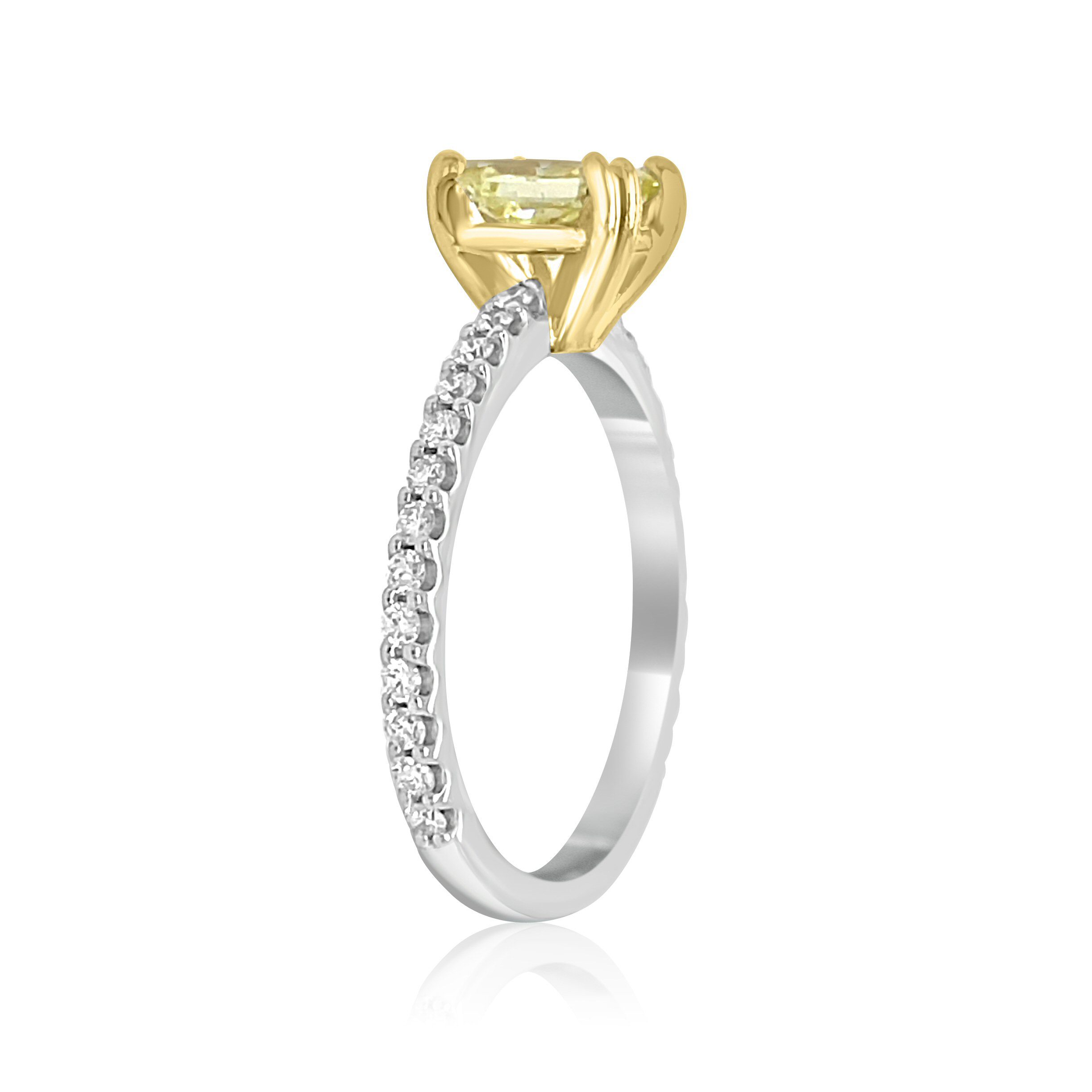 14 karat white and yellow gold 1.27cttw diamond ring. The centerpiece of the ring is a 1.01 carat radiant cut natural fancy intense yellow diamond of I1 clarity. It is certified as such by Gemological Institute of America certificate #7201074017. It is set in a yellow gold head and has 0.26cttw round brilliant cut diamonds on the band. These diamonds are SI2 clarity and G-H in color. The diamond may be purchased separately for $7,000.