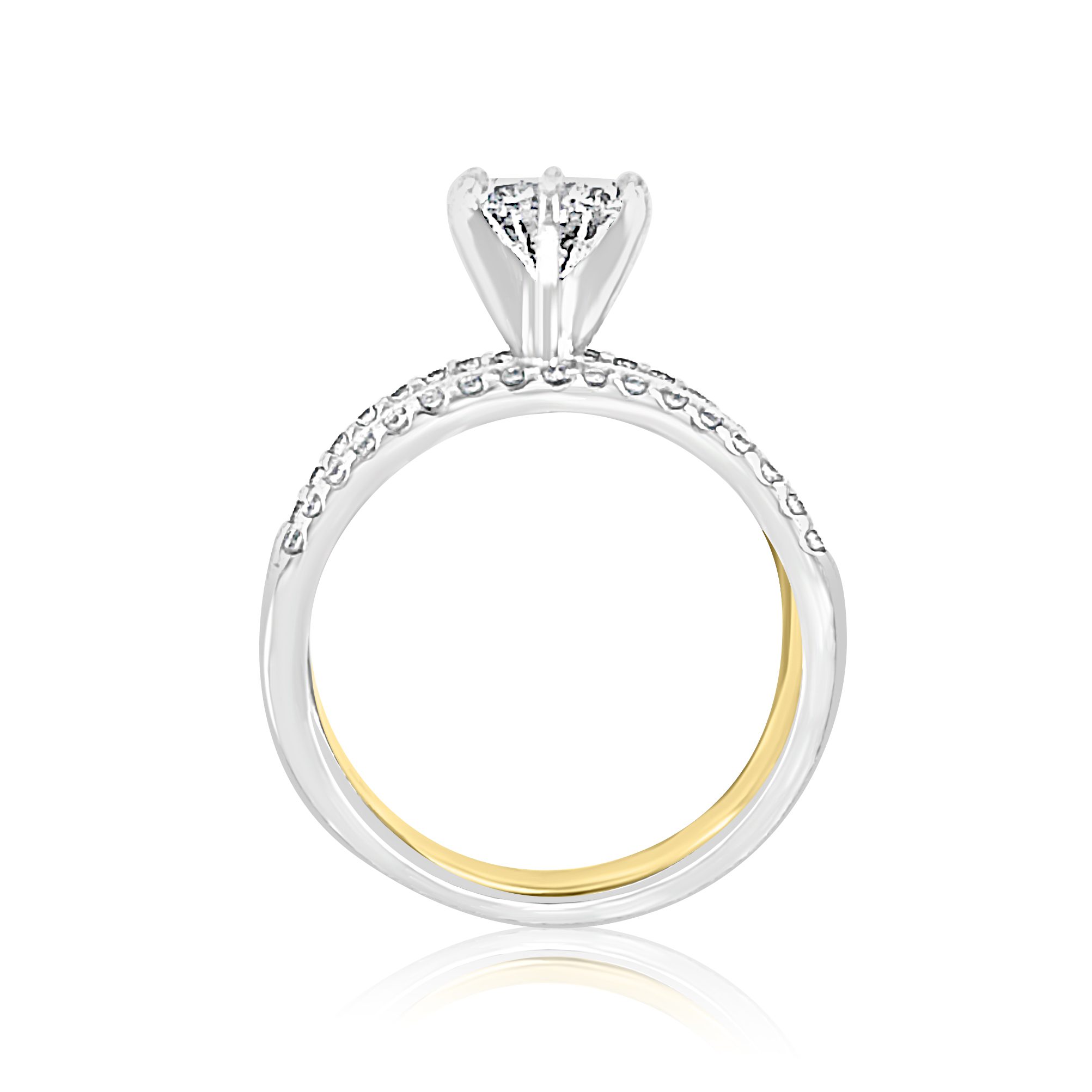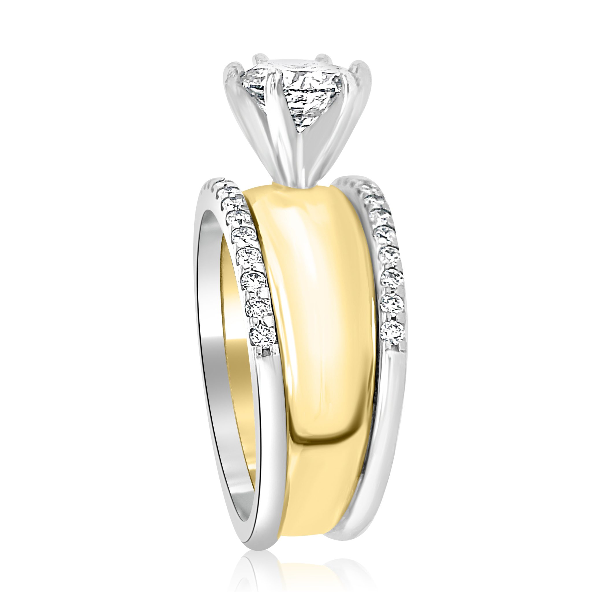 Stunning 2.34 cttw diamond ring! The center diamond is a 2.02 carat round brilliant cut diamond of SI1 clarity, J color and is certified as such by GIA laboratory and is certificate #222104422. It is set in a 14 karat white gold 6 prong tiffany head on a14 karat yellow gold 8mm wide tapered band. On either side of the wide band are 0.16 cttw. round brilliant cut diamonds for just the right amount of accent. The center diamond may be purchased separately for $15,000.