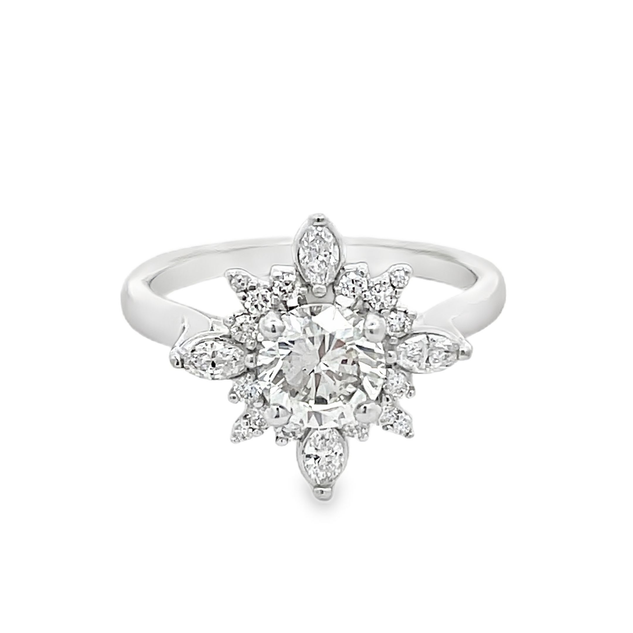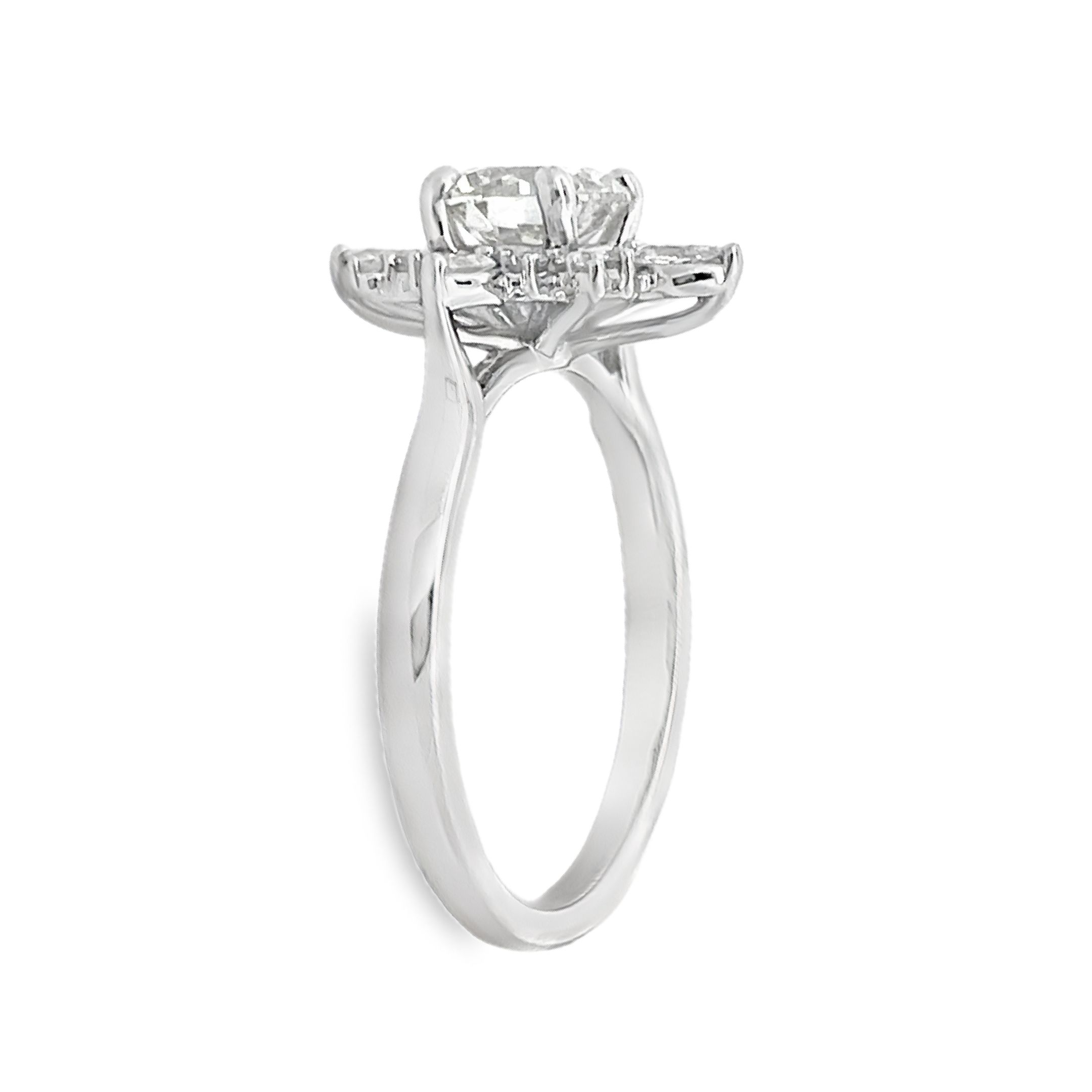 14 karat white gold 1.35cttw diamond ring. The center diamond is a 0.98 carat round brilliant cut diamond of VS2 clarity and J color and is certified as such by Gemological Institute of America, certificate #2231101413. The center diamond may be purchasedseparately for $5,200.
