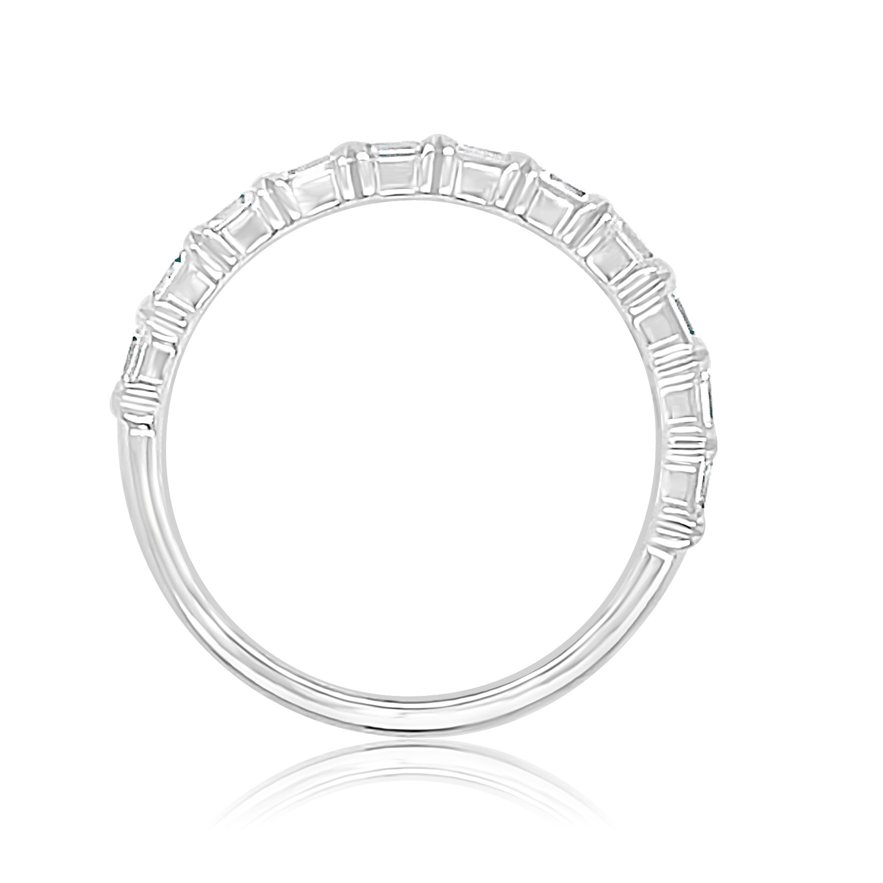 14 karat white gold band with 0.75 cttw baguette cut diamonds, set east-west. These diamonds are VS clarity and G color creating a simply elegant and gorgeous wedding band to complement engagement ring style # RA-0936W.