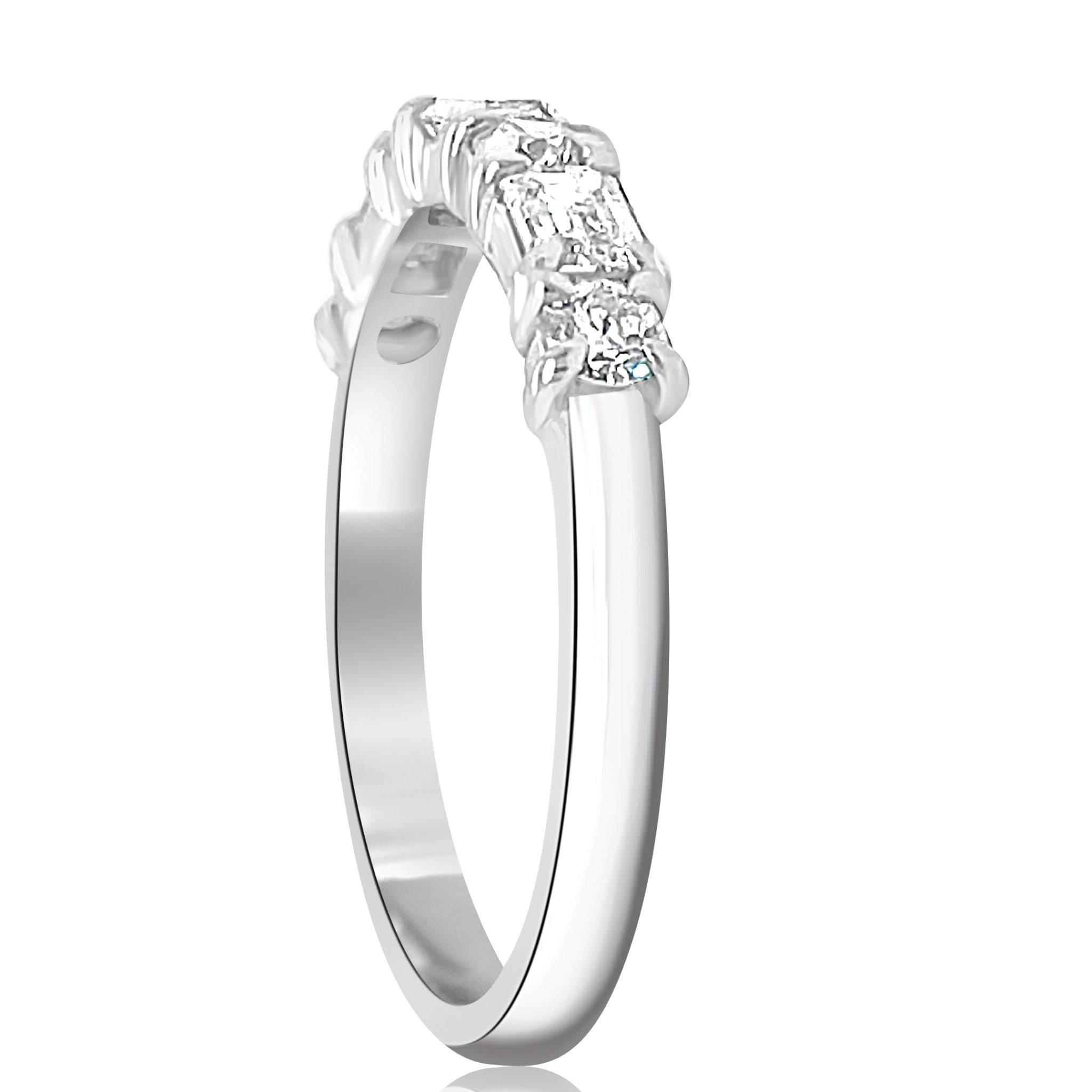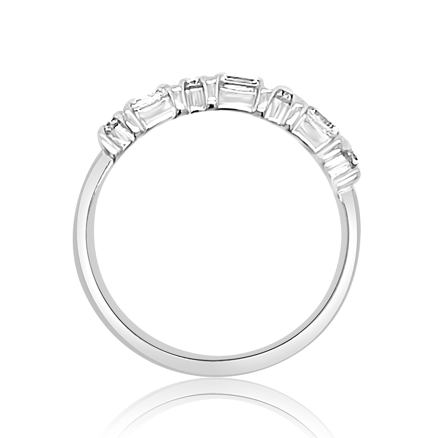 18 karat white gold .65cttw diamond ring by Sophia by Design. There are .39cttw baguette cut and .26cttw round brilliant cut diamonds. The emerald cut diamonds are set East-West and alternate with the round brilliant cut diamonds. As in all of Sophia’s 18karat jewelry, the diamonds are VS clarity and G color. A beautiful wedding band, anniversary band or ring to wear on any finger, every day.