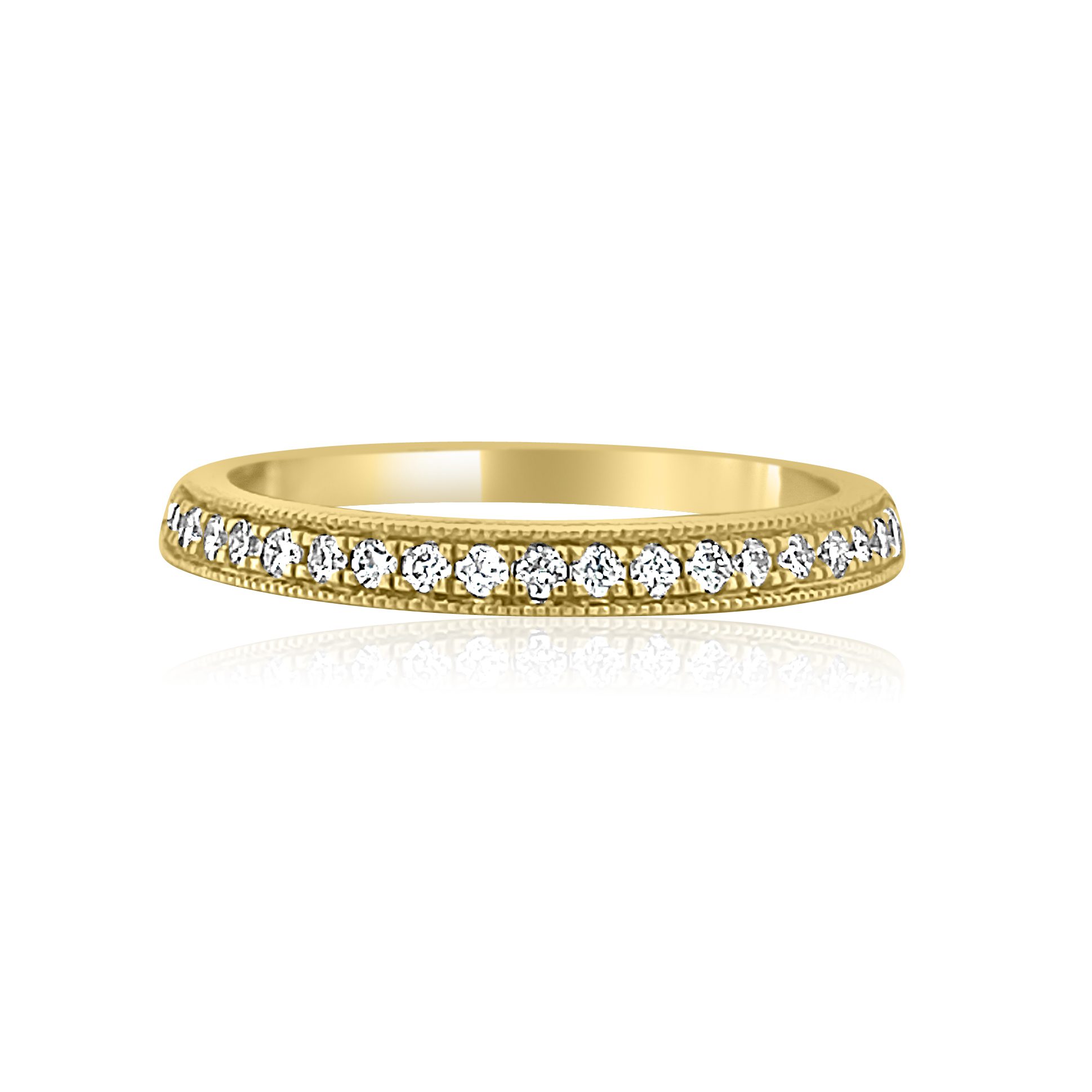 Gorgeous 14 karat yellow gold 0.21cttw diamond wedding band. The inside edge of the ring is flat to fit against most engagement AND fashion rings. There is a lovely milgrain edge hugging the prong set diamonds. Also, these diamonds are VS clarity and F-Gin color.