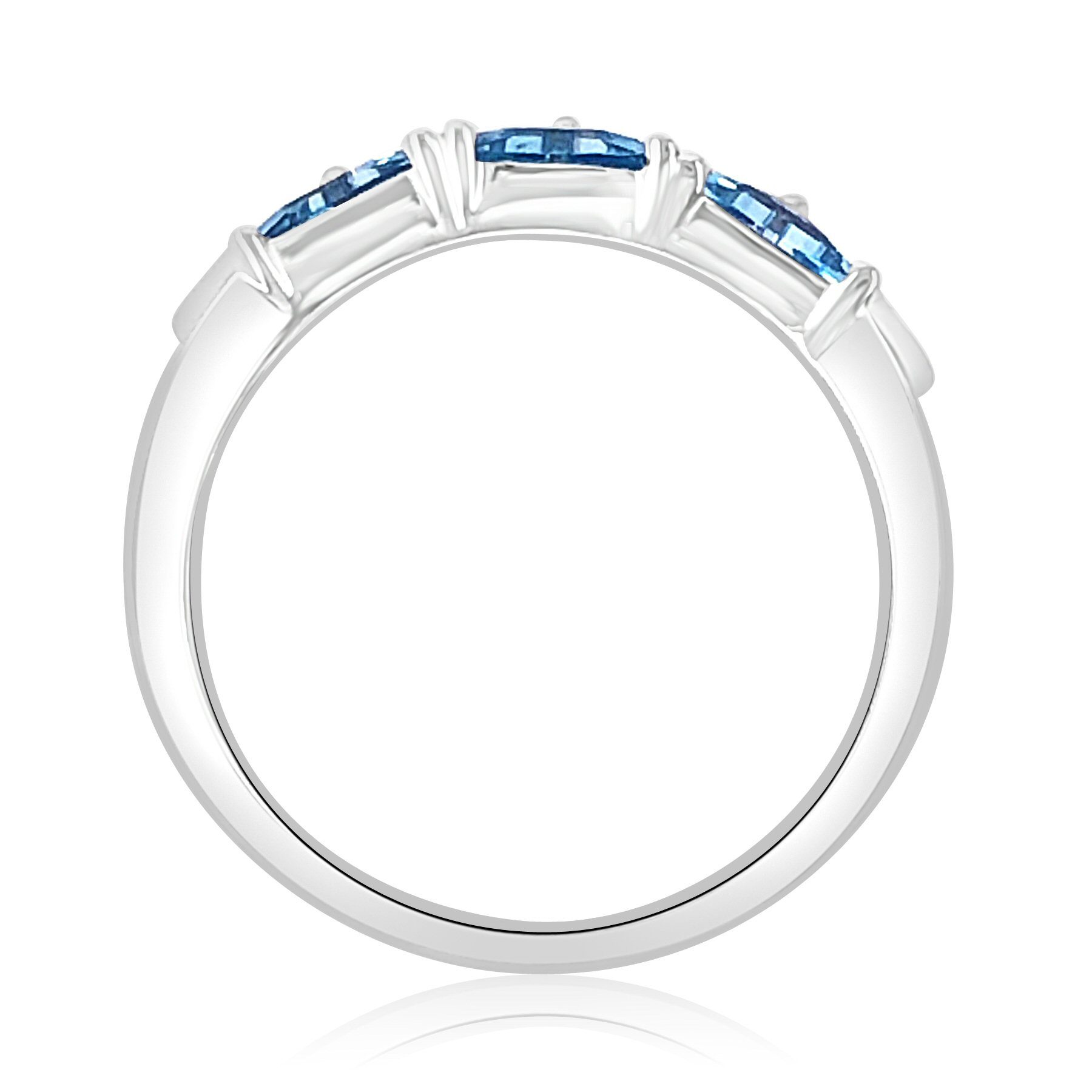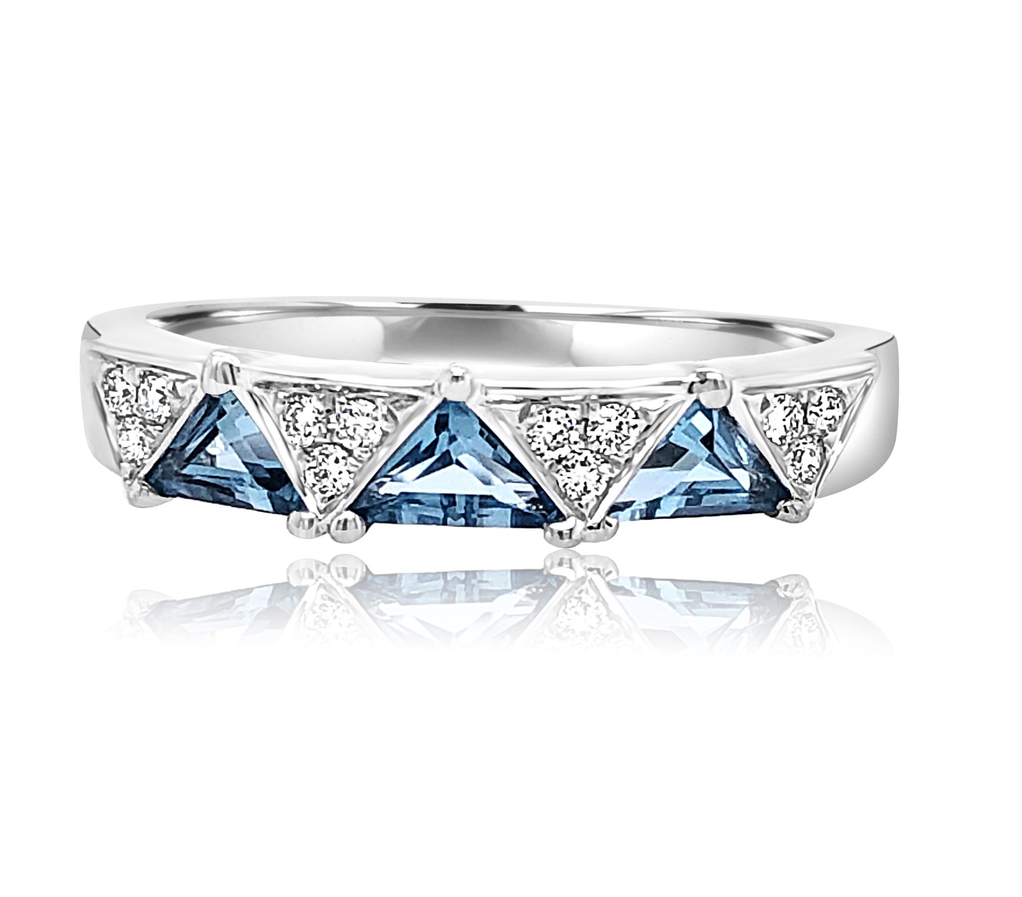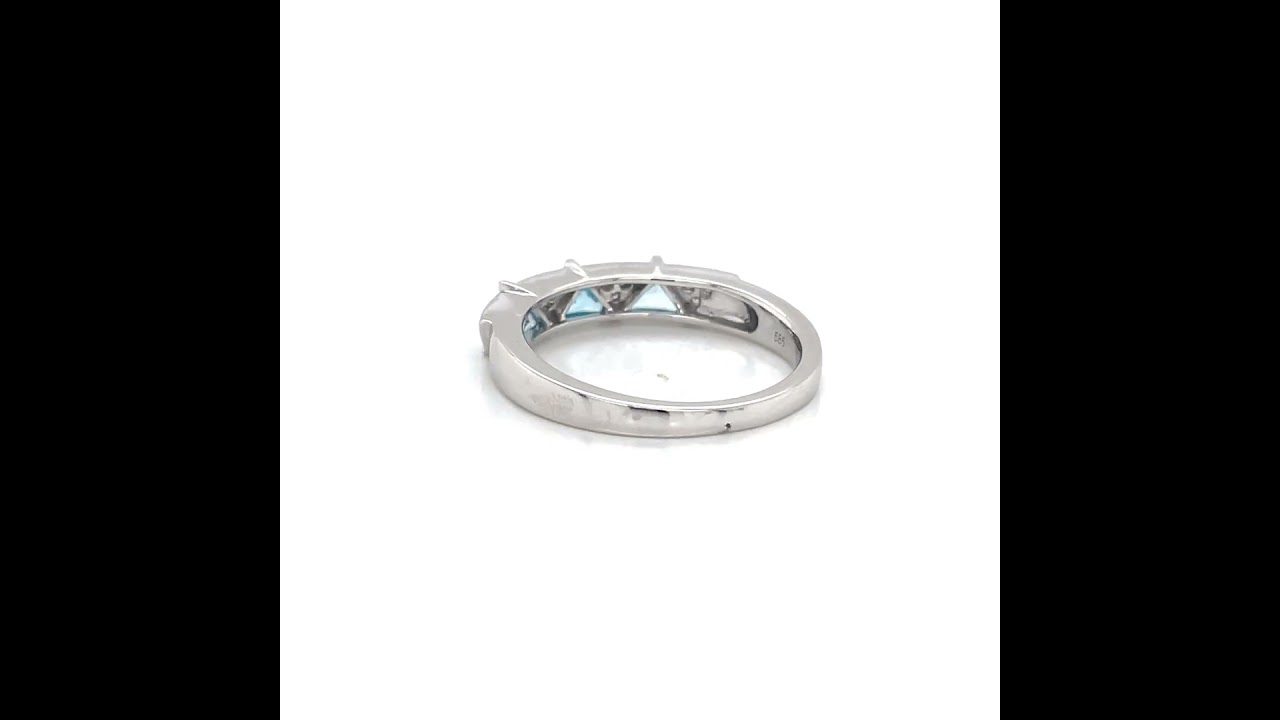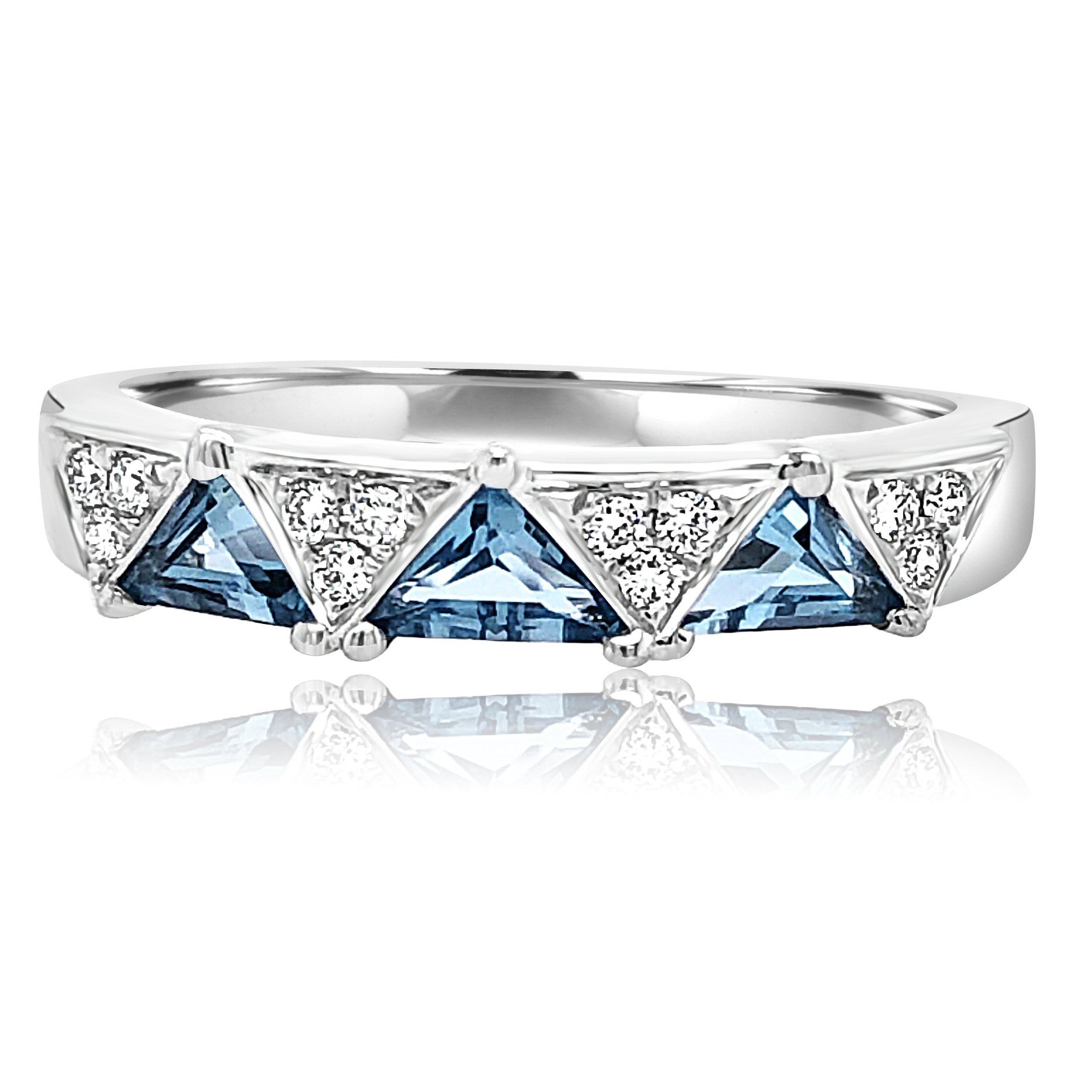 14 karat white gold stackable blue topaz ring with 0.55 cttw triangle cut blue topaz and 0.10 cttw. round brilliant cut diamonds.