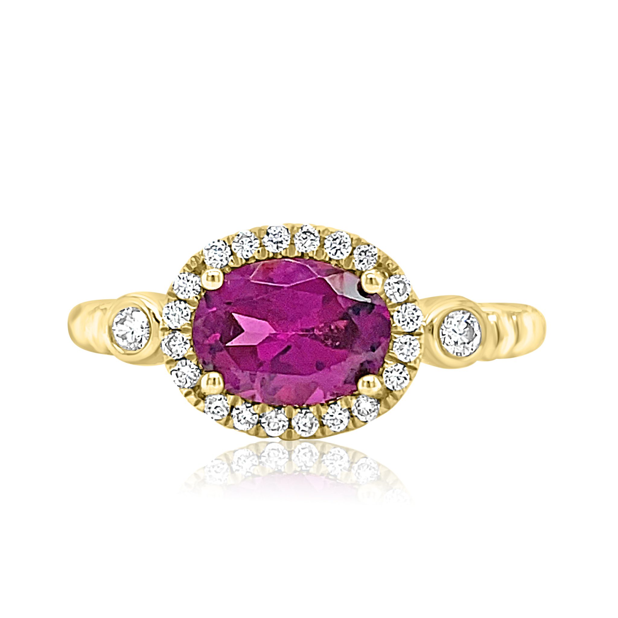 14 karat yellow gold garnet and diamond ring. 1.59ct grape garnet, 0.16cttw diamonds